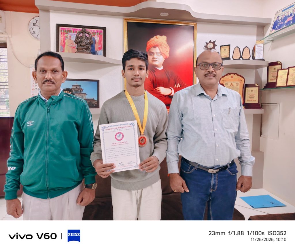 ગુજરાત રાજ્ય જૂડો એસોસિએશન દ્વારા ગુજરાત રાજ્ય જૂડો ચેમ્પિયનશીપ-૨૦૨૫-૨૬ નું આયોજન સ્પોર્ટ્સ કોમ્પ્લેક્ષ ,વડનગર ખાતે તારીખ.૨૩/૧૧/૨૫ ના રોજ કરવામાં આવેલ જેમાં ધી નડીઆદ એજ્યુકેશન સોસાયટી સંચાલિત નડીઆદની નામાંકિત સી. બી પટેલ આર્ટસ કોલેજમાં અભ્યાસ કરતો વિદ્યાર્થી શેખ આમીરહસન એમ. કે જેઓ જૂડોની વેઇટ કેટેગરી -૬૦ કિલોગ્રામમાં સ્પર્ધા કરતા ત્રણ ફાઈટને અંતે ચોથી ફાઈટ જીતતા ત્રીજા નંબરે રહીને બ્રોન્ઝ મેડલ અને પ્રમાણપત્ર મેળવીને સમગ્ર ચરોતર પંથકમાં રાજ્ય અને રાષ્ટ્ર્રકક્ષાએ તેની આ ઝળહળતી સિદ્ધિએ કોલેજનું નામ રોશન કરેલ છે. તેઓની આ સિદ્ધિ બદલ કોલેજના આચાર્ય ડૉ.મહેન્દ્રકુમાર એ.દવે, સ્પોર્ટ્સ ડાયરેક્ટર ડો.પ્રકાશ રાઠવા તથા સમગ્ર સી. બી. પટેલ આર્ટસ કોલેજ પરિવારે આ વિદ્યાર્થીને અભિનંદન પાઠવીને તેઓ આ ક્ષેત્રે વધુને વધુ પ્રગતિ કરે તેવી શુભેચ્છાઓ પાઠવી હતી.
