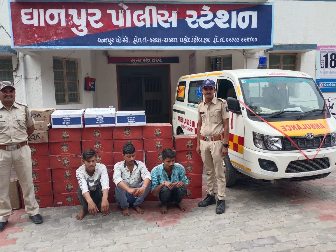 ગત તા. ૨૪મી માર્ચના રોજ ધાનપુર પોલીસને મળેલ બાતમીના આધારે બાટણપુરા ગામે નાકાબંધી કરી આવતાં જતાં તમામ નાના મોટા વાહનોની તલાસી હાથ ધરતાં હતાં તે સમયે ત્યાંથી બાતમીમાં દર્શાવેલ એક એમ્બ્યુલંશ ગાડી પસાર થતાં પોલીસ સાબદી બની હતી અને એમ્બ્યુંલંશ ગાડીના ચાલક સુનીલભાઈ પાનસીંગભાઈ સંગાડીયા, સુરેશભાઈ સેવલાભાઈ બારીઆ અને અર્જુનભાઈ કરણસિંહ માવી (ત્રણેય રહે. અલીરાજપુર, મધ્યપ્રદેશ) નાઓની અટકાયત કરી એમ્બ્યુલંશ ગાડીની તલાસી લેતાં પોલીસ ચોંકી ઉઠી હતી. એમ્બ્યુલંશ ગાડીમાંથી વિદેશી દારૂ તથા બીયરની કુલ બોટલો નંગ. ૧૧૫૨ કિંમત રૂા. ૧,૩૧,૦૪૦ના પ્રોહી જથ્થા સાથે એમ્બ્યુલંશ ગાડીની કિંમત મળી કુલ રૂા. ૪,૪૬,૦૪૦નો મુદ્દામાલ પોલીસે કબજે કરી ઉપરોક્ત ત્રણેય ઈસમો વિરૂધ્ધ ધાનપુર પોલીસે પ્રોહીનો ગુનો નોંધી આગળની કાયદેસરની કાર્યવાહી હાથ ધરી છે.