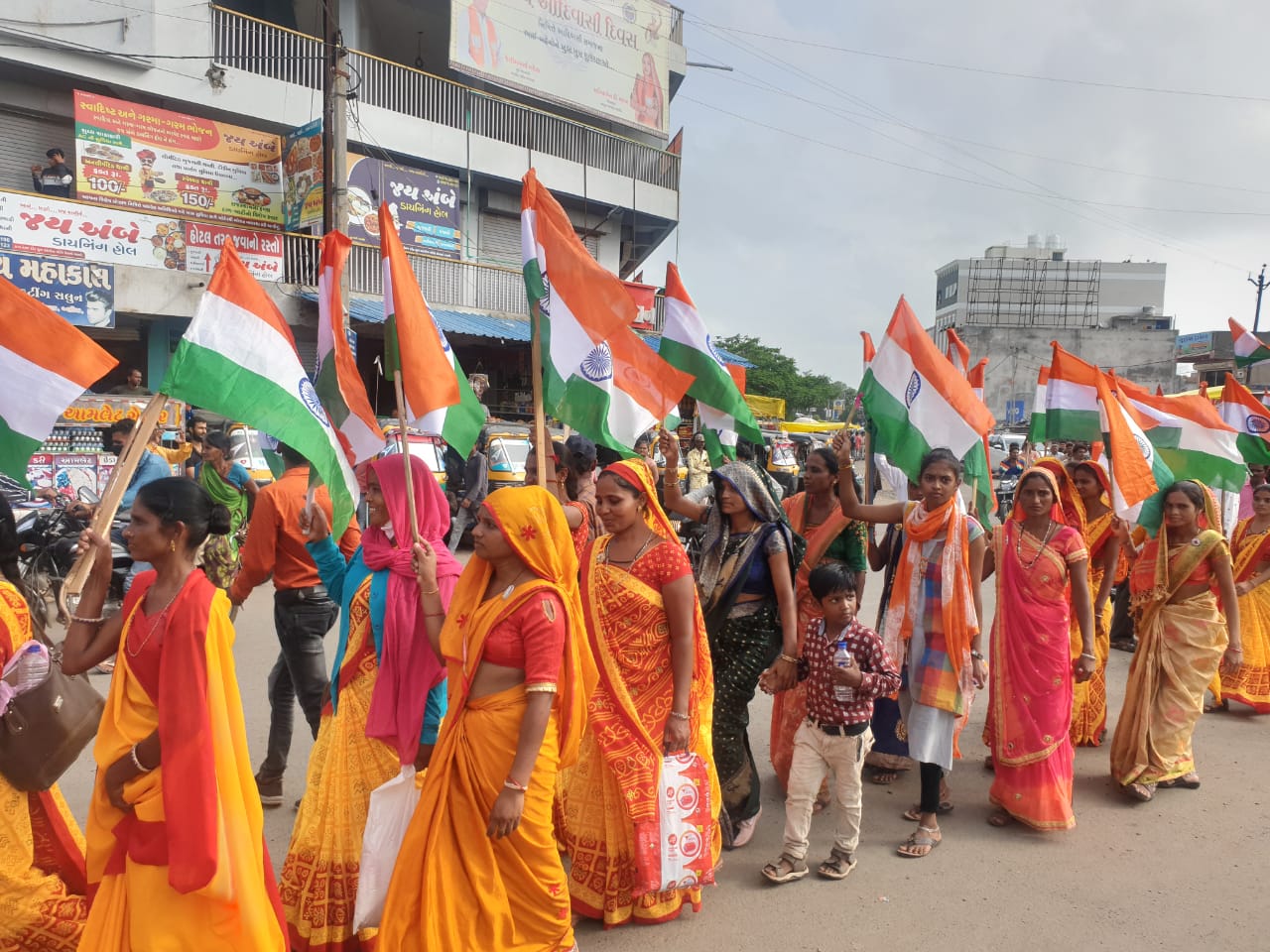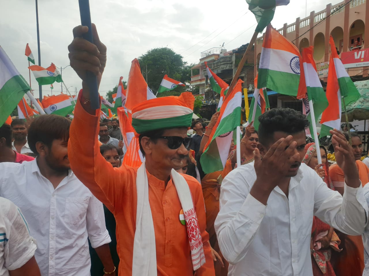 ઝાલોદ નગરમાં આજ રોજ 13-08-2022 શનિવારના રોજ સાંજે 4:30 વાગે મુવાડા ચોકડી પરથી તિરંગા યાત્રા નીકળી હતી ,નગરના તિરંગા યાત્રાના આગેવાનોને આજે ખૂબ જ સારો સહકાર મળ્યો હતો, મુવાડા ચોકડી પરથી તિરંગા યાત્રા કાઢવામાં આવી હતી ત્યાં સ્વૈચ્છિક જનમેદની ઉમટી પડી હતી દરેકના ચહેરા પર દેશ પ્રેમ છલકાતો જોવા મળતો હતો, દેશની આન બાન શાનમાં કઈ બાકીના રહે તેમ હિન્દુ હોય કે મુસ્લિમ દેશના ઝંડાને ખુબજ ગર્વ થી લઈ તિરંગા યાત્રામાં જોડાયા હતા, દરેક સમાજના આગેવાનો પોતાના મિત્ર મંડળ સાથે યાત્રામાં જોડાયા હતા, દેશના તીરંગાની આન માં કે શાન માં કઈ બાકીના રહે તેની ખૂબજ કાળજી રાખતા હતા, સૌ ના ચહેરા પર તિરંગા ઉત્સવને લઈ ખુબજ આતુરતા જોવાઈ રહી હતી દરેક વ્યક્તિ દેશ પ્રત્યે પ્રેમ સન્માન અને આદરના કોઈ કમીં નાં રહે તેની કાળજી લેતા હતા ,આખા વિશ્વમાં રેકોર્ડ સમાન ભારતમાં તિરંગા ઉત્સવ ઉજવાઈ રહ્યો છે જે અકલ્પનીય છે, નરેન્દ્ર મોદીના એક હાકલ પર ભારતવર્ષ નાં દરેક લોકો જોડાયા હતા ,ઝાલોદ નગરનાં આગેવાનો દ્વારા ખુબજ સરસ સંકલન પ્રમાણે આયોજન થઈ રહ્યું હતું દરેક લોકો આગેવાનોને મળી દેશ પ્રત્યે કઈ કરવા માટે આતુરતા બતાવતા હતા, ખૂબ જ મોટા પ્રમાણમાં સ્વયંભુ લોકો જોડાતા ઝાલોદ નગર માટે એક ઉત્સવ જેવું વાતાવરણ લાગતું હતું, તિરંગા યાત્રાને દરેક વિસ્તારમાં સ્વાગત થતું હતું તેમજ વંદે માતરમ્, ભારત માતા કી જય સાથે વાતાવરણ ગુંજી ઉઠયું હતું તિરંગા યાત્રા મુવાડા થી રામજી મંદિર - સરદાર ચોક -આંબેડકર ચોક - મોચી દરવાજા - વોહરા બજાર - મસ્જિદ - માંડલી - ગીતામંદિર - સ્વર્ણિમ સર્કલ કોલીવાડા - મીઠાચોક - કસ્બા - તળાવ -લુહારવાડા - વડ બજાર પરથી થઈ ભરત ટાવર પર સમાપન થઈ હતી.