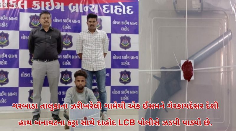 ગરબાડા તાલુકાના ઝરીખરેલી ગામેથી એક ઈસમને ગેરકાયદેસર દેશી હાથ બનાવટના કટ્ટા સાથે દાહોદ LCB પોલીસે ઝડપી પાડ્યો છે.