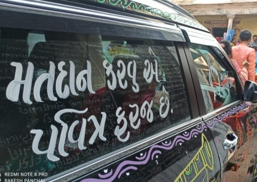 વરરાજા સ્લોગન સાથે કાર સજાવી માડવે પહોંચ્યા