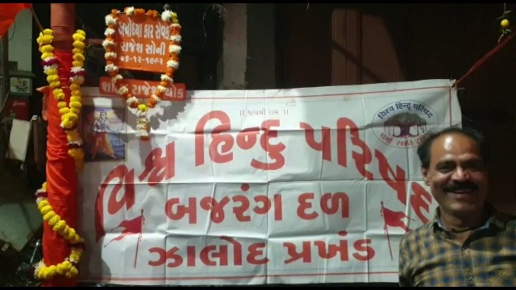 ઝાલોદ નગરના રાજેશચોકમાં નગરના વિશ્વ હિન્દુ પરિષદ પ્રખંડ,બજરંગ દળ તેમજ હિન્દુ પ્રેમી લોકો દ્વારા રાજેશ સોનીનાં બલિદાન આપેલ દિવસને દિપ પ્રગટાવી શ્રધ્ધાંજલિનો કાર્યક્રમ આજરોજ 06-12-2022 ના રોજ સાંજે ૭ વાગ્યે રાખવામાં આવ્યો હતો તેમાં નગરના લોકો ખૂબ મોટા પ્રમાણમાં જોડાયા હતા.શ્રી રામનું નામ લખી રામ નામ થી અને સાથિયો દોરી દીવડા સજાવી પ્રગટાવવામાં આવ્યા હતા. શહીદ રાજેશ સોની ચોક ખાતે રામધૂનની રમઝટ તેમજ કેસરીયા ઝંડાની સાથે લોકો મોટા પ્રમાણમાં જોડાયા હતા. શહીદ રાજેશ ચોકને હિન્દુ પ્રેમી લોકોએ જય શ્રી રામ અને શહીદ રાજેશ સોની અમર રહોના નારા સાથે ગજવી દીધું હતું. તેમજ ફટાકડા ની ગુંજ થી આખું શહીદ રાજેશ ચોક ગુંજી ઉઠયું હતું.