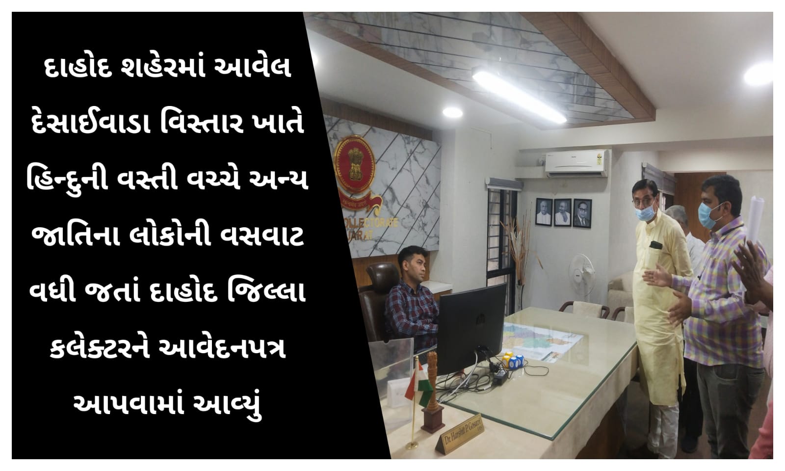 દાહોદ શહેરમાં આવેલ દેસાઈવાડા વિસ્તાર ખાતે હિન્દુની વસ્તી વચ્ચે અન્ય જાતિના લોકોની વસવાટ વધી જતાં આ વિસ્તારના હિન્દુ સમાજના લોકો દ્વારા આ મામલે વિરોધ નોંધાંવી આ વિસ્તારમાં અશાંત ધારો લાગુ કરવા દાહોદ જિલ્લા કલેક્ટરને આવેદનપત્ર આપવામાં આવેલ છે.