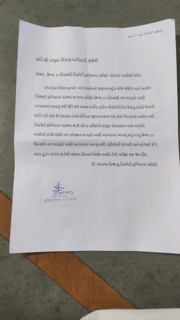 છેલ્લા 15 દિવસથી પીવાના પાણીથી વંચિત રહેતા સ્થાનિકોએ તાલુકા પંચાયત કચેરીના દ્વાર ખખડાવ્યા.