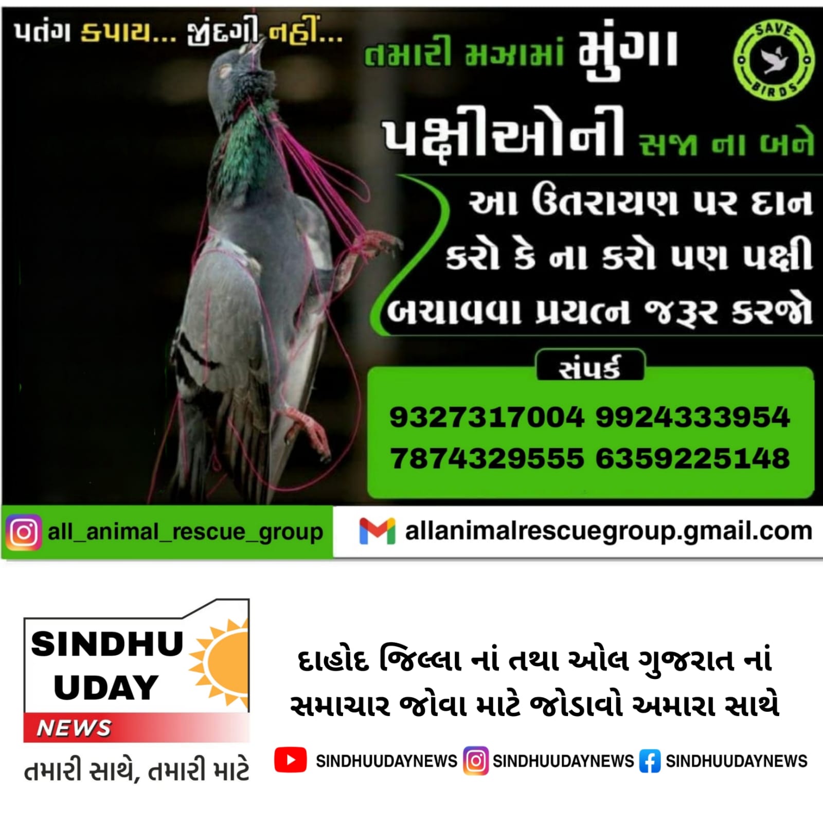 દાહોદ સીટી વિસ્તારમાં તમને ઘાયલ પક્ષી કૅ દોરા માં ફસાયલુ જોવાય તો તાત્કાલિ અમારા ગ્રુપ ને સંપર્ક કરવો.