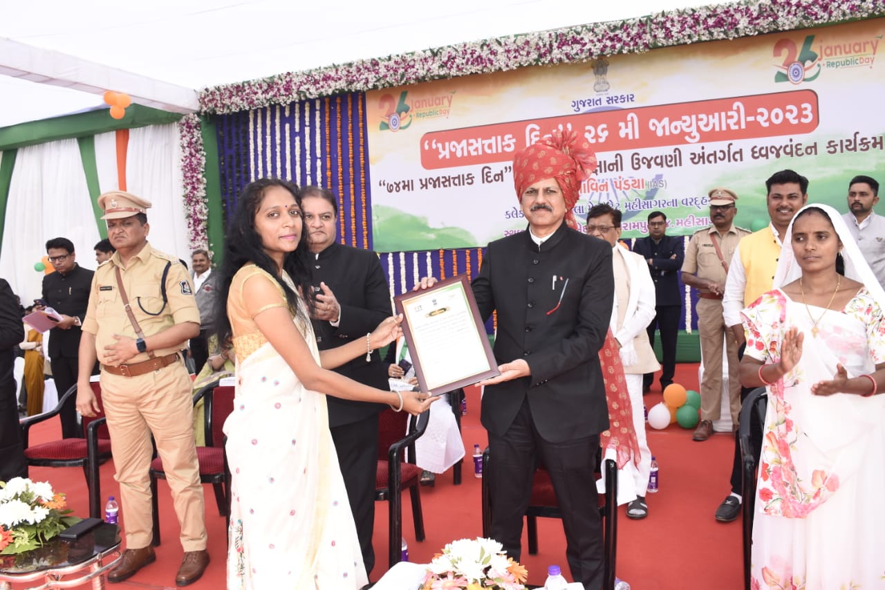 સંતરામપુર આઝાદ મેદાન ખાતે મહાનુભાવોના હસ્તે વૃક્ષા રોપણ કરાયું મહીસાગર જિલ્લામાં ૭૪માં પ્રજાસત્તાક પર્વની શાનદાર ઉજવણી આઝાદ મેદાન સંતરામપુર ખાતે કરવામાં આવી હતી. મહીસાગર જિલ્લા કલેક્ટર અને જિલ્લા મેજીસ્ટ્રેટશ્રી ભાવિન પંડ્યાએ ધ્વજ વંદન કરી ત્રિરંગાને સલામી આપી હતી. ધ્વજવંદન કર્યા બાદ શ્રી ભાવિન પંડ્યાએ પરેડનું નિરીક્ષણ કરી સલામી ઝીલી હતી.૭૪માં પ્રજાસત્તાક પર્વની ઉજવણી પ્રસંગે અધ્યક્ષસ્થાનેથી જિલ્લા કલેક્ટરશ્રી ભાવિન પંડ્યાએ જિલ્લા કક્ષાના રાષ્ટ્રીય પર્વ નિમિત્તે નાગરીકોને શુભકામના પાઠવી સંબોધતાં જણાવ્યું હતું કે, આજના આ પર્વની ઉજવણી સંતરામપુર ખાતે થઇ રહી છે. તે આપણા બધા માટે ગૌરવની વાત છે તેમજ ભારતની આઝાદી માટે જાન ન્યોછાવર કરનારા અનેક નામી અનામી શહિદોને શ્રધ્ધા સુમન અર્પણ કરૂ છું. સરદાર વલ્લભભાઇ પટેલે દેશી રજવાડાંઓનું એકત્રીકરણ કરીને દેશની એકતા અને અખંડિતતા ટકાવી રાખવાનું જે ભગીરથ કાર્ય કર્યું હતું. ત્યારે આપણા સૌની પણ પવિત્ર ફરજ બની રહે છે કે દેશની એકતા અને અખંડિતતા ટકાવી રાખવા માટે આપણે સૌએ સંકલ્પબધ્ધ થવું પડશે.ઇ.સ.૧૯૧૩માં સંતરામપુર તાલુકામાં આવેલ માનગઢ હીલ્સ ખાતેનો સ્વાતંત્ર્ય સંગ્રામ એ માત્ર મહિસાગરનો જ નહી પરંતુ સમગ્ર ભારતની ભવ્ય પરંપરા અને ગૌરવશાળી ઇતિહાસ છે. આ સંગ્રામમાં ગોવિંદ ગુરૂની રાષ્ટ્રભક્તિની પ્રેરણાથી અંગ્રેજો સાથે સ્થાનિકોનો સંઘર્ષ થયો જેમાં ગોવિંદ ગુરૂ સહિત ૧૫૦૭ જેટલા લોકો દેશ પ્રેમ માટે શહાદત્ત પામ્યા આ શહાદતની ઝાંખી કરાવતું માનગઢ ધામ આજે પ્રવાસીઓના આકર્ષણનું કેન્દ્ર બન્યું છે. આ શહાદતને આપણે વિશ્વના તમામ લોકો સમક્ષ રજુ કરી શકીએ તે માટે માનગઢ ધામના વિકાસ માટે મહિસાગર જિલ્લા તંત્ર હંમેશા આગળ રહેશે તથા આપણા માટે ખુશીની વાત એ છે કે વિકાસ માટે જરુરી તમામ સહાય રાજ્ય સરકાર તરફથી પણ અવારનવાર મળી રહે છે.ચાલુ વર્ષે મહિસાગર જિલ્લામાં ખરીફ ઋતુમાં૧,૧૪,૯૭૦ હે.જેટલું વાવેતર થયેલ હતુ. જેમાં મુખ્ય પાક