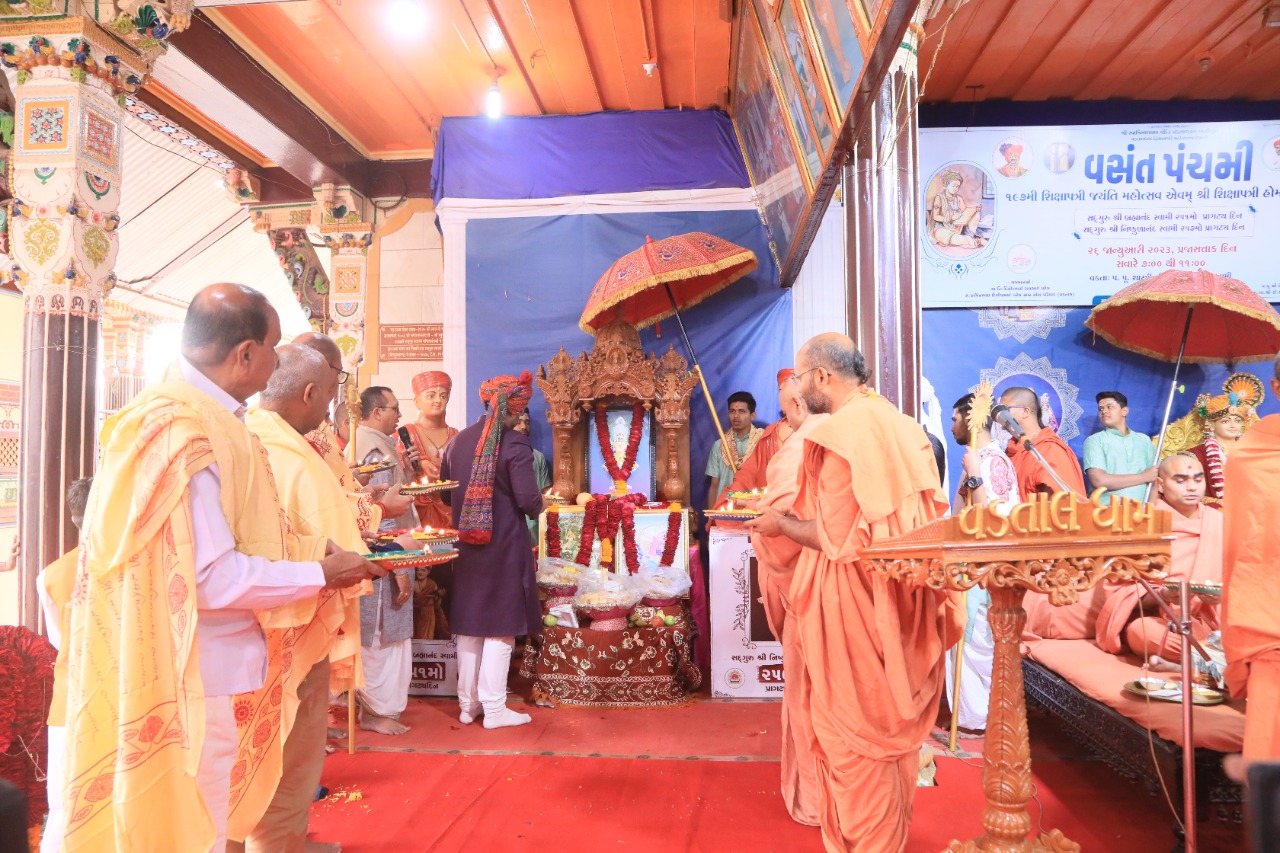 વડતાલઃઅક્ષરધામ તુલ્ય વડતાલધામમાં ૨૬મી જાન્યુઆરીને ગુરૂવારના રોજ વસંતોત્સવ સાથે ૧૯૭ મી શિક્ષાપત્રી જયંતિની ધામધુમથી ઉજવણી કરવામાં આવી હતી, સાથે સાથે હરિ મંડપના પાછળના ભાગે યોજાયેલ શિક્ષાપત્રી યજ્ઞનો પૂ.લાલજી મહારાજ તથા કોઠારી ર્ડા. સંત સ્વામીએ પ્રારંભ કરાવ્યો હતો. વડતાલ મંદિરના પટાંગણમાં પૂ.લાલજી મહારાજ તથા કોઠારી ડૉ. સંત સ્વામીએ ધ્વજવંદન કરી પ્રજાસત્તાક દિનની હર્ષોલ્લાસ સાથે ઉજવણી કરી હતી.