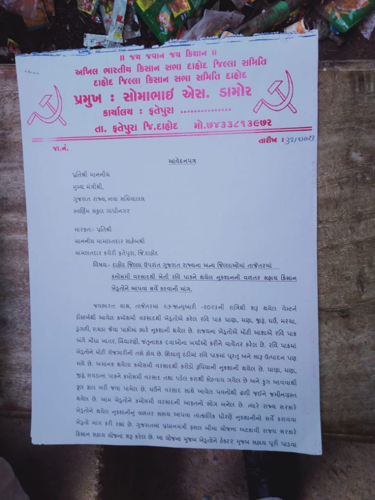 અખિલ ભારતીય કિશાન સભા દાહોદ જિલ્લા દ્વારા કિસાનો ને વળતર સહાય આપવા સર્વે કરવાની માંગ કરી.