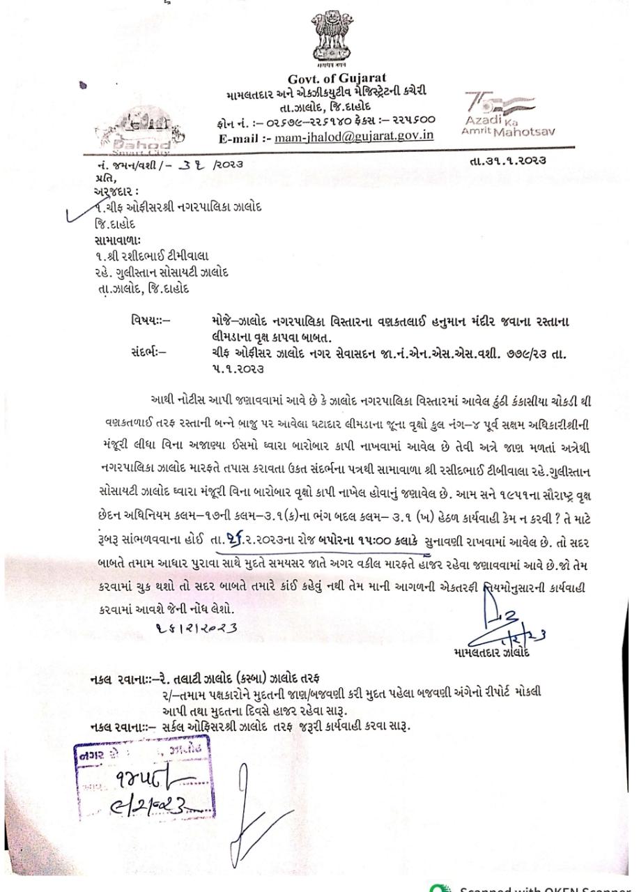 ઝાલોદ નગરપાલિકા વિસ્તારમાં આવેલ ઠુંઠી કંકાસીયા ચોકડી થી વણકતળાઈ હનુમાન મંદિર તરફ રસ્તાની બન્ને બાજુ પર આવેલા ઘટાદાર લીમડાના જૂના વૃક્ષો કુલ નંગ-4 પૂર્વ સક્ષમ અધિકારીની મંજૂરી લીધા વિના અજાણ્યા ઇસમો દ્વારા બારોબાર કાપી નાખવામાં આવેલ હતા એવી માહિતી મામલતદાર કચેરીને મળેલ હતી, મામલતદાર દ્વારા નગરપાલિકા મારફતે તપાસ કરાવતા રસીદભાઈ ટીબીવાલા ( રહે.ગુલીસ્તાન સોસાયટી )નું નામ બહાર આવેલ છે. મામલતદાર કચેરી દ્વારા તલાટી, ઝાલોદ અને સર્કલ ઓફિસર ઝાલોદ પાસે વધુ માહિતી અને જવાબો તારીખ 16-03-2023ના બપોરે 3 કલાકે રોજ વધુ કાર્યવાહી અંતર્ગત માહિતી ભેગી કરી રૂબરૂ સુનાવણી માટે બોલાવવામાં આવેલ છે.