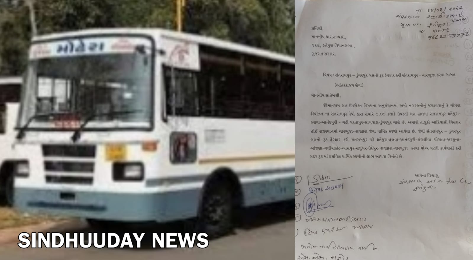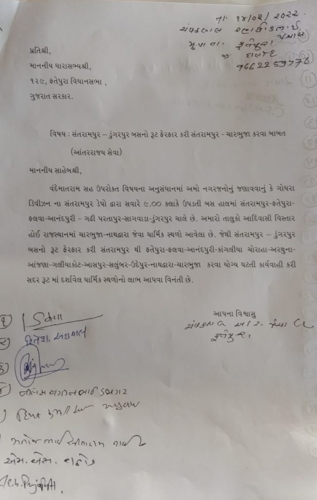 સંતરામપુર થી ડુંગરપુર આંતરરાજ્ય બસના રૂટમાં ફેરફાર કરવા થયેલ રજૂઆતસામાજિક કાર્યકર્તા ચંપકભાઈ પંચાલ દ્વારા ધારાસભ્ય શ્રી રમેશભાઈ કટારા ફતેપુરા ને લેખિતમાં કરેલ રજૂઆત