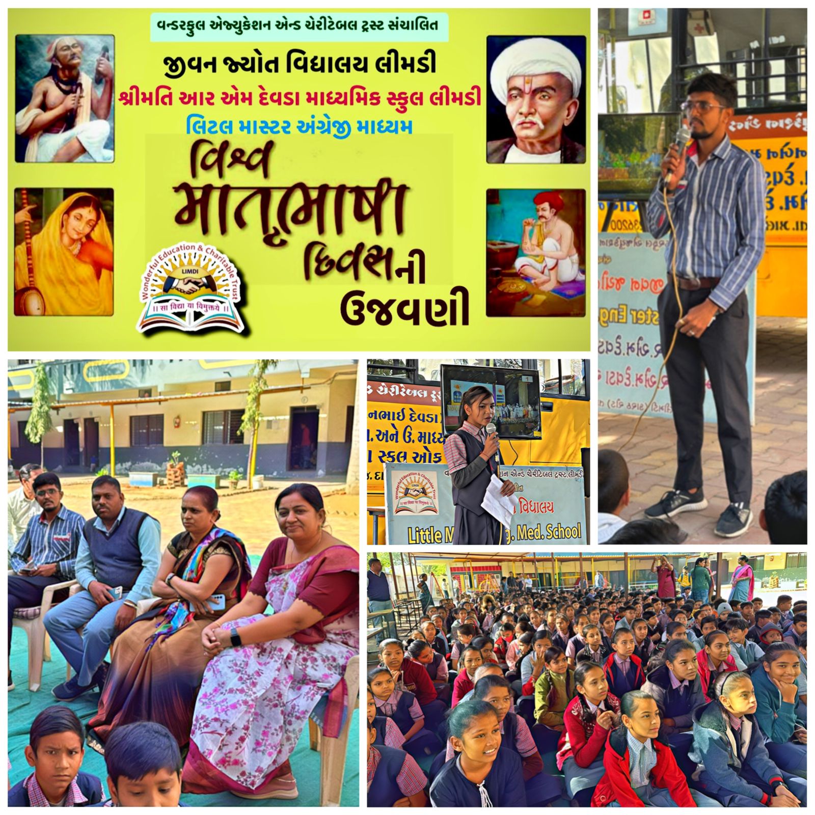 માનનીય મુખ્યમંત્રીશ્રીના અધ્યક્ષ સ્થાને આયોજિત કાર્યક્રમ વિશ્વ માતૃભાષા દિવસનું જીવંત પ્રસારણ જીવન જ્યોત વિદ્યાલય લીમડીના પટાંગણમાં રાખવામાં આવ્યું હતું. જેમાં શાળાના આચાર્યશ્રી, મેનેજમેન્ટ વિભાગ, શિક્ષક મિત્રો, તથા વિદ્યાર્થી બાળ ભૂલકાઓએ લાઈવ પ્રસારણ નિહાળ્યું હતું. જેમાં શાળાના આચાર્ય શ્રી કુલદીપ પી મોરી સાહેબે માતૃભાષા નું મહત્વ સમજાવતા કહ્યું કે જે વિદ્યાર્થીની માતૃભાષા સમૃદ્ધ છે, તે બીજા વિષયોમાં પણ ની પૂર્ણ થાય છે અનેક સંદર્ભો આપી માતૃભાષા આપણા વ્યક્તિત્વને કઈ રીતે પોશાક બને છે તેવી વાત કરી તેમ જ અંગ્રેજી માધ્યમ તરફ વધુ પડતો જોગ બાળકોને બોનફાઈ બનાવી દે છે જર્મની જેવા દેશોએ અનેક શોધગોળ અને વૈજ્ઞાનિક કે ઇજનરી સિદ્ધિઓ માતૃભાષા દ્વારા જ પ્રાપ્ત કરી છે. તેમજ માતૃભાષા નું ગૌરવ જાળવવું હોય તો આપણે માતૃભાષામાં વાંચન લેખન વધારવું જોઈએ આપણે લોક કથાઓ લોકગીતોનો ખૂબ સમૃદ્ધ વારસો છે. ભાષા એ અન્ય વિષયોને શીખવાનું માધ્યમ છે ત્યારે આપણી આપણી માતૃભાષોને અવગણીએ તે યોગ્ય નથી. તદ ઉપરાંત શાળાના માધ્યમિક વિભાગના મદદનીશ શિક્ષક રક્ષાબેને માતૃભાષા વિશે વિસ્તૃત માહિતી આપી વિદ્યાર્થીઓને માહિતગાર કર્યા હતા. તે પછી શાળાના ઉચ્ચતર પ્રાથમિક વિભાગના યશોદાબેન તથા સરલાબેને માતૃભાષા વિશે સંપૂર્ણ ઝીણવટ ભરી માહિતી આપી માહિતગાર કર્યા હતા અને આ પ્રસંગે શાળાની વિદ્યાર્થીનીએ જણાવ્યું હતું કે દરેક વિદ્યાર્થીઓને ઓછામાં ઓછી બે ભાષા આવડવી જ જોઈએ તેનું સૂચન કર્યું હતું . આ માતૃભાષાના ઉજવણી અનુરૂપ અંગ્રેજી માધ્યમના આચાર્ય એ ગુજરાતી ભાષાનું મહત્વ કેટલું જરૂરી છે તે અંગે સારી રીતે માર્ગદર્શન આપી વિદ્યાર્થીઓને વાકેફ કરી કાર્યક્રમની આભાર વિધિ યશોદાબેને કરી માતૃભાષા દિન ઉજવણીની પુનરાવતી કરી હતી.