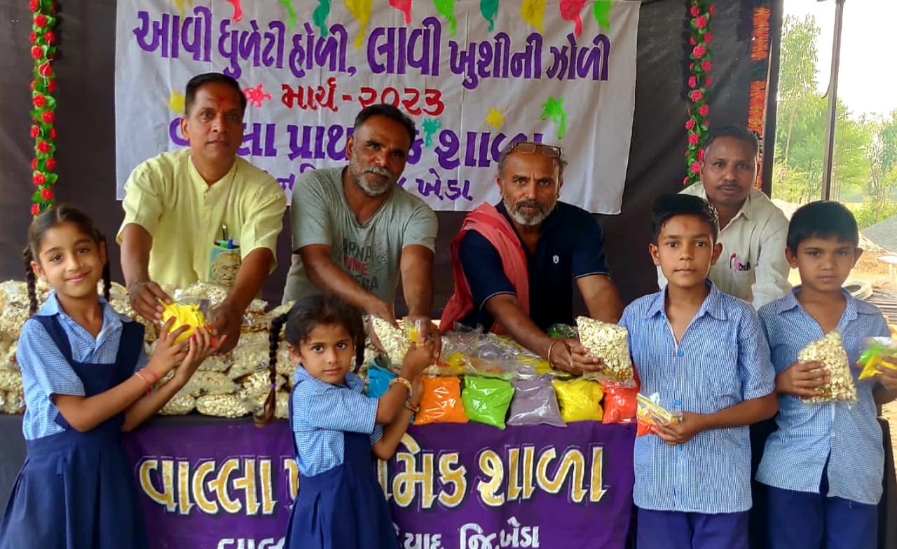 નડિયાદ તાલુકાની વાલ્લા પ્રાથમિક શાળા આપણાં વિવિધ તહેવાર- ઉત્સવની સાચી ઉજવણી કરીને જીવાતા જીવનના જીવંત અનુભવ પૂરા પાડી જીવન ઉપયોગી શિક્ષણ આપી રહી છે.શિક્ષણ-સંસ્કાર-સંસ્કૃતિ શીખવતી આ શાળાએ “આવી ધુળેટી હોળી,લાવી ખુશીની ઝોળી “નામે પ્રેરક પ્રવૃતિ યોજી છે.શાળાના શિક્ષક હિતેશકુમાર બ્રહ્મભટ્ટ અનેક નવતર પ્રયોગ દ્વારા શિક્ષણકેન્દ્રી અને સમાજકેન્દ્રી કાર્યો કરે છે.તેમણે શાળાના વિદ્યાર્થીઓ પાસે ચોખાનો લોટ તથા ફૂડ કલરમાંથી ‘હર્બલ હોળી કલર ‘ તૈયાર કરાવી શાળા -આંગણવાડીના ૨૦૦ વિદ્યાર્થીઓને આપ્યા છે.બજારમાં મળતાં કલર કેમિકલવાળા હોવાથી ત્વચા સંબંધી અનેક સમસ્યાઓ કરે છે એલર્જી પણ થાય છે.ત્યારે આ હર્બલ કલર ખૂબ જ નિર્દોષ છે અને આ કોઈ સમસ્યાઓ પણ થતી નથી.વિશેષ આ તમામ કલર સૂકા આપ્યા છે..બાળકોને પીચકારી આપી નથી તેથી પાણીનો વેડફાટ અટકે છે.આમ,પાણી બચાવવાનો પાવન સંદેશ પણ અહીં દેખાય છે.જે ખેડા જિલ્લાનો પ્રથમ નવતર પ્રયોગ છે.હોળી ધુળેટીના તહેવારમાં ધાણી,ચણા,ખજૂરનો વિશેષ મહિમા છે. જેનાથી શરીરમાં જમા થયેલ કફની ચીકાશ દૂર થાય છે.કફ,વાયુ,ખાંસી અને થાક દૂર કરે છે.બળવર્ધક પણ છે.તેથી તમામ વિદ્યાર્થીઓને ધાણી ચણા ખજૂરની કીટ પણ તૈયાર કરી અપાઈ છે.ઉપરાંત હોળીનો વિશેષ મહિમા સમજાવતી ભક્ત પ્રહલાદ નૃત્ય નાટિકાની પણ રજૂઆત કરાઈ છે. હર્બલ કલર કીટ અને ધાણી-ચણા-ખજૂરની કીટના દાતા વિશ્વ ગાયત્રી પરિવાર-સારસાના નિત્યાનંદ ગોરધનભાઈ પટેલ તથા હિતેશકુમાર બ્રહ્મભટ્ટ સહયોગી બન્યા હતા. આ કીટ ગામના સરપંચ અશ્વીનભાઈ વાળંદ ,ઉપ સરપંચ અશોકભાઈ પરમાર અને શિક્ષકોના હસ્તે તમામ ૨૦૦ બાળકોને અપાઈ હતી.સાચી ઉત્સવ ઉજવણી અને પ્રકૃતિ રક્ષણની આ પ્રેરક પ્રવૃત્તિને સફળ બનાવવા હિતેશકુમાર બ્રહ્મભટ્ટ સાથે આચાર્ય જયપાલસિંહ ઝાલા,નયનાબેન બ્રહ્મભટ્ટ ,પિનાકિનીબેન રામી,સેજલબેન પંડ્યા,સતીશભાઈ પટેલ, નિર્મલભાઈ પટેલ અને નિલેશભાઈ ઝાપડિયા હાજર રહ્યા હતા.