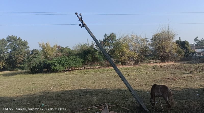 સંજેલી બાયપાસ ચોકડી પર નમી ગયેલા વીજ થાભલા લટકતી તલવાર સમાન.