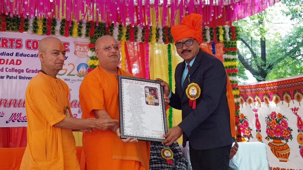 ધી નડિયાદ એજ્યુકેશન સોસાયટી સંચાલિત સી.બી. પટેલ આર્ટસ કોલેજ, નડિયાદમાં વાર્ષિકોત્સવ નું આયોજન શનિવારે ના રોજ થયું હતું. સી.બી  પટેલ આર્ટસ કોલેજ,નડિયાદના પ્રાંગણમાં યોજાનાર આ વાર્ષિકોત્સવમાં નડિયાદ સંતરામ મંદિરના  પરમપૂજ્ય સંત શ્રી નિર્ગુણદાસજી મહારાજ તેમજ ઉમરેઠ સંતરામ મંદિરના પરમ પૂજ્ય સંત શ્રીગણેશદાસજી મહારાજ આશીર્વાદ આપવા પધારી કોલેજ પરિવારને કૃત કૃત્ય ર્ક્યા  . ઉપરાંત સરદાર પટેલ યુનિવર્સિટીના કા. વાઇસ ચેન્સલર પ્રો.નિરંજનભાઇ પટેલ મુખ્ય અતિથિ રુપે પધારી વિદ્યાર્થીઓને વિશિષ્ટ ઉદ્બોધન કરી કાર્યક્રમ ની શોભા વધારી હતી . તથા ધી નડિયાદ એજ્યુકેશન સોસાયટીના મંત્રી ભૂપેન્દ્રભાઇ દેસાઈના અધ્યક્ષિય પ્રવચન  વિદ્યાર્થીઓ તથા સમગ્ર કોલેજ પરિવારને પ્રેરકબળ પૂરું પાડનાર બની રહ્યું સહ મંત્રી ચન્દ્રકાન્ત ભાઇ પટેલ તથા તથા ખજાનચી પુરુષોત્તમ ભાઇ પટેલ  તેમજ અન્ય શ્રેષ્ઠિઓ તથા ભગિની સંસ્થા ના આચાર્યઓ -અધ્યાપકઓ તથા નિમંત્રિત મહાનુભાવો ની બહોળી ઉપસ્થિતિમાં તેમજ તમામ વિદ્યાર્થીઓની હાજરીમાં આ દબદબાભેર વાર્ષિકોત્સવ આયોજિત થયો હતો.. કોલેજના આચાર્ય પ્રો. ડો. મહેન્દ્રકુમાર દવે સર દ્વારા વિદાય લેતા વિદ્યાર્થીઓને આપેલ દિક્ષાંત પ્રવચન માં શિક્ષા ની જગ્યાએ દિક્ષા મેળવી સમાજ ઉપકારક બનવાની હાકલ કરી હતી આચાર્યશ્રીના વિશિષ્ટ  માર્ગદર્શન અને પ્રોત્સાહનથી આ કાર્યક્રમનું સફળ આયોજન  થયું હતું, જેમાં વર્ષ દરમ્યાન કોલેજમાં થયેલ વિવિધ આયોજનો – ગતિવિધિ ના આલેખન ઉપરાંત કોલેજના શ્રેષ્ઠ વિદ્યાર્થીઓને  તથા ઈન્ટરનેશનલ પત્રિકા માં  અર્થશાસ્ત્ર ના વિદ્યાર્થીઓના પ્રકાશિત લેખ બાબતે સર્ટિફિકેટ તથા  ઇનામ વિતરણ  કાર્યક્રમ ઉપરાંત સેમ-૩ માં સમગ્ર યુનિવર્સિટીમાં પ્રથમ નંબર આવનાર આયશા વોરા તથા અન્ય શૈક્ષણિક તથા સ્પોર્ટ્સ, એન.સી.સી. , એન.એસ.એસ તથા અન્ય પ્રવૃત્તિઓ માં શ્રેષ્ઠતા પ્રાપ્ત કરનાર સૌ શ્રેષ્ઠ વિદ્યાર્થીઓને મોમેન્ટો તથા સર્ટિફિકેટ અને રોકડ પુરસ્કાર આપીને બિરદાવ્યા હતા તેમજ કાર્યક્રમને સંગીન બનાવવા સાંસ્કૃતિક કાર્યક્રમનું પણ આયોજન થયું હતું. આચાર્યને યુનિવર્સિટીના સેનેટર સભ્ય ઉપરાંત  કાશીથી હાંસલ કરેલ ડી.લિટની ઉપાધિ બદલ સન્માનિત કરાયા હતા. ડૉ. કલ્પનાબેન ત્રિવેદીને પણ યુનિવર્સિટીના સેનેટ સભ્ય  બદલ સન્માનિત કરાયા હતા. આ ઉપરાંત નવા નિમણૂક પામેલ અધ્યાપક તેમજ નિવૃત કર્મચારીઓનું પણ સન્માન થયું હતું . ઉલ્લેખનીય છે કે કોલેજના અંગ્રેજી વિભાગના અધ્યક્ષા પ્રો.નિશાબેને વ્યાસ કોલેજને વિવિધ પ્રવૃત્તિઓ માટે  ચેક તથા દિવ્યાંગ માટે વ્હીલ ચેર  તથા પ્રો.એલ.ડી.ચાવડા તરફથી નેશનલ પરેડ માટે પસંદગી પામેલા એન.સી.સી.ના બે ક્રેડર્સને  ચેક અર્પણ ર્ક્યા,અન્ય અધ્યાપકઓ એ પણ વિદ્યાર્થીઓને પ્રો