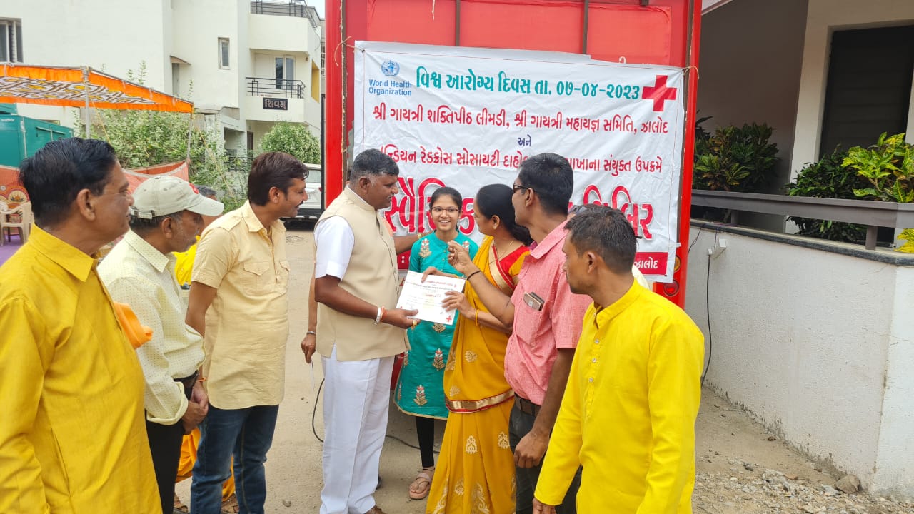 વિશ્વ આરોગ્ય દિવસ નિમિત્તે ગાયત્રી પરિવાર ઝાલોદ અને લીંમડી દ્વારા 7/4/2023 ના રોજ એક રક્તદાન શિબિર નું આયોજન ઝાલોદ ખાતે કરવામાં આવ્યું હતું મોટી સંખ્યામાં મહિલાઓ દ્વારા રક્તદાન કરવામાં આવ્યું હતું આ શિબિરમાં ઇન્ડિયન રેડ ક્રોસ સોસાયટી દાહોદ જિલ્લા શાખાવતી એન કે પરમાર અને નરેશ ચાવડા તેમજ સ્ટાફ ટીમ હાજર રહી હતી ગાયત્રી પરિવારના શ્રી રાજુભાઈ સેવક તેમજ પ્રકૃતિ મિત્ર મંડળ લીમડીના અલ્કેશભાઇ વૈરાગી અને તેની ટીમ દ્વારા સરાહનીય કામગીરી કરવામાં આવી હતી આ પ્રસંગે ગાયત્રી પરિવારના સભ્યો તેમજ ઝાલોદના ધારાસભ્ય શ્રી મહેશભાઈ ભુરીયાએ પણ હાજરી આપી હતી ટ્રેઝરર કમલેશ લીમ્બાચીયા દ્વારા તમામ રક્તદાતા આભાર માન્યો હતો