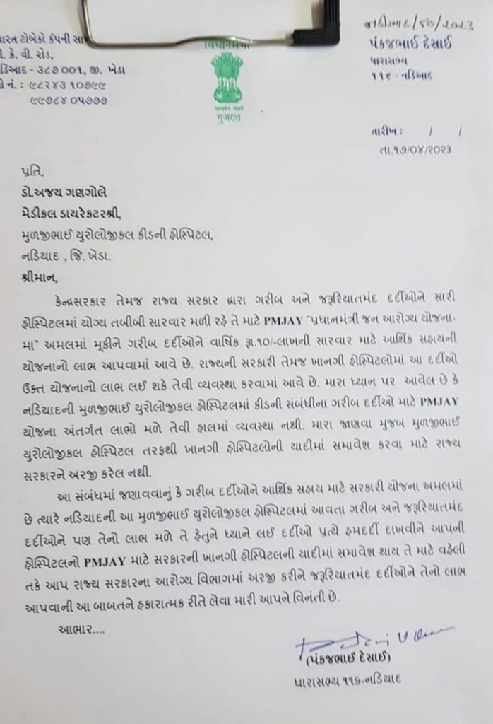 આ સંબંધમાં જણાવવાનું કે ગરીબ દર્દીઓને આર્થિક સહાય માટે સરકારી યોજના અમલમાં છે ત્યારે નડિયાદની આ મુળજીભાઈ યુરોલોજીકલ હોસ્પિટલમાં આવતા ગરીબ અને જરૂરિયાતમ દર્દીઓને પણ તેનો લાભ મળે તે હેતુને ધ્યાને લઈ દર્દીઓ પ્રત્યે હમદર્દી દાખવીને આ હોસ્પિટલનો PMJAY માટે સરકારની ખાનગી હોસ્પિટલની યાદીમાં સમાવેશ થાય તે માટે વહેલી તકે રાજ્ય સરકારના આરોગ્ય વિભાગમાં અરજી કરીને જરૂરિયાતમંદ દર્દીઓને તેનો લાભ આપવા વિનંતી છે.