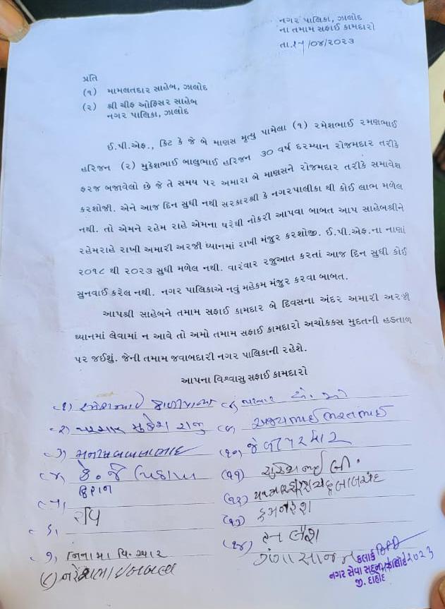 2018 થી 2023 સુધીના ઇ.પી.એફનાં નાણાની પણ માંગણી કરાઈ ઝાલોદ નગરપાલિકાના બે સફાઈ કર્મચારીઓ ( 1 ) રમેશભાઈ રમણભાઈ હરિજન ( 2 ) મુકેશભાઈ બાલુભાઇ હરિજન જે રોજમદાર તરીકે ઝાલોદ નગરપાલિકામાં ફરજ નિભાવતા હતા. જે તે સમયે બંને કર્મચારીઓને રોજમદાર તરીકે નોકરી કરતા હતા પરંતુ આજ દિન સુધી બંને કર્મચારીઓને સરકાર દ્વારા કે નગરપાલિકા દ્વારા કોઈ લાભ મળેલ નથી. તો આ પરિવારના સદસ્યોને રહેમરાહે નોકરી આપવા માટે સફાઈ કર્મચારીઓ દ્વારા લેખિતમાં માંગ કરેલ છે. તેમજ ૨૦૧૮ થી ૨૦૨૩ સુધીના ઇ.પી.એફનાં નાણાં નગરપાલિકાને વારંવાર કર્મચારીઓ દ્વારા માંગણી કરેલ હોવા છતાય કોઈ સુનવાઈ થયેલ નથી તેમજ નગરપાલિકા નવું મહેકમ મંજુર કરે તેવી પણ માંગ સફાઈ કર્મચારીઓ દ્વારા કરવામાં આવેલ છે. સફાઈ કર્મચારીઓ દ્વારા લેખિત અરજીને બે દિવસમાં ધ્યાનમાં લેવાં માંગ કરેલ છે. જો આ અરજીને ધ્યાનમાં લેવામાં નહીં આવેતો અચોક્કસ મુદતની હડતાળ પર જવાની લેખિત ચિમકી ઉચ્ચારવામાં આવેલ છે.