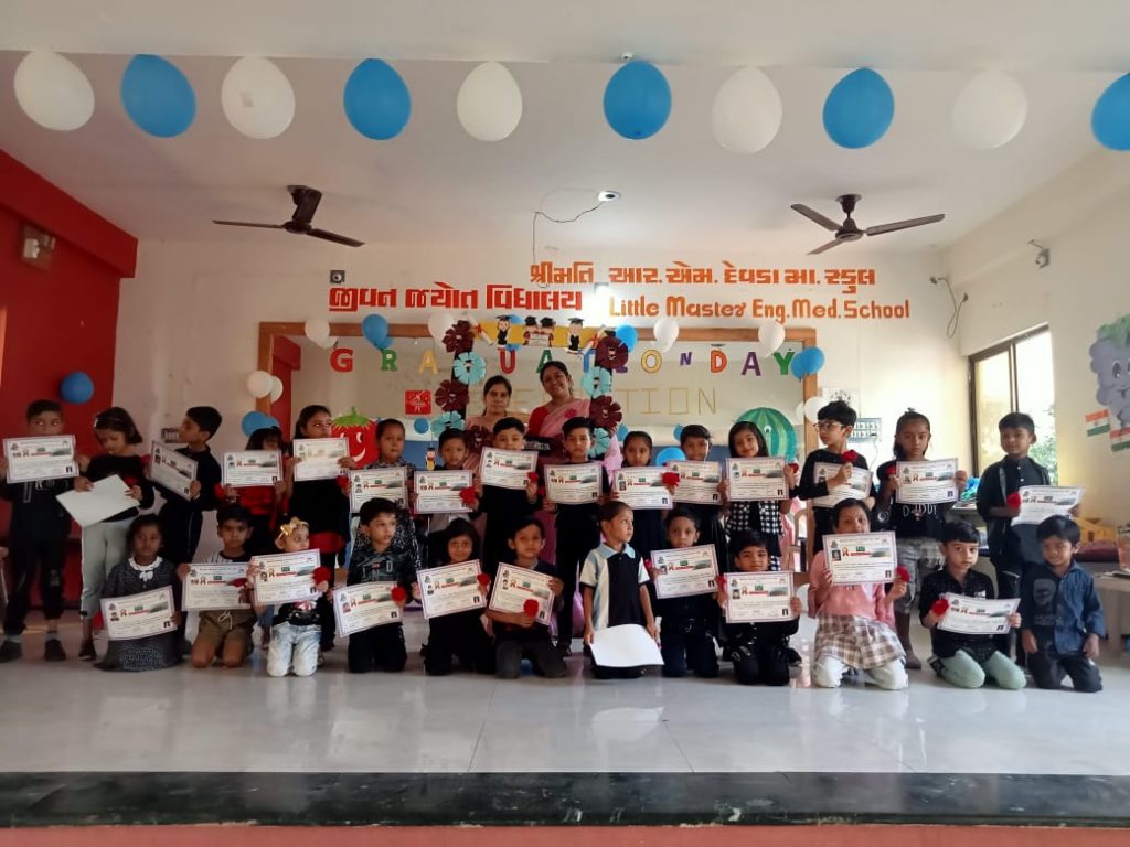 લિટલ માસ્ટર ઇંગ્લિશ મીડિયમ સ્કૂલ લીમડી તા – 27/04/2023 નાં રોજ કેજી 2 નાં બાળકોનું graduation day નું આયોજન કરવામાં આવ્યું હતું. તેમાં શાળાના આચાર્યા મિત્તલ.એન.શર્માના માર્ગ દર્શન હેઠળ સિનિયર કેજી નાં ટીચર લતાબેન તેમનાં કેજી વિભાગના શિક્ષકમિત્રો સાથે મળીને કાર્ય કર્યું હતું . આજના પ્રસંગમાં બાળકો શાળામાં તેમનાં માતા પિતા સાથે આવ્યા હતાં. વિદ્યાર્થીઓને પ્રમાણપત્રો અને ઈનામ આપી સન્માનિત કર્યા અને તેઓના ઉજ્જવળ ભવિષ્ય માટે શુભેચ્છા પાઠવી હતી. આ પ્રસંગે સંબોધતા, શાળાના આચાર્યાએ સૂચના આપી હતી કે વિદ્યાર્થીઓના જુસ્સાને વધારવા અને તેઓને આગલા સ્તરમાં પ્રવેશવાની અનુભૂતિ કરાવવાના હેતુથી આ પદવીદાન સમારોહનું આયોજન કરવામાં આવ્યું છે. પ્રવૃત્તિઓ બાળકોમાં આત્મવિશ્વાસ કેળવે છે, તેમને જીવનમાં આગળ વધવામાં મદદ કરે છે અને સફળતાના શિખરોને સ્પર્શે છે.