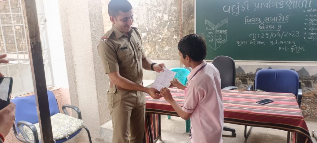 ધોરણ 8 માં અભ્યાસ કરતા બાળકોનો વિદાય સમારંભ યોજાયો તેમજ પરિણામોત્વ યોજાયોઆજરોજ ફતેપુરા તાલુકાની વલુંડી પ્રાથમિક શાળા(સરકારી)ખાતે ફતેપુરા PSI જી કે ભરવાડ સાહેબની ઉપસ્થિતિમાં ધોરણ 8 માં અભ્યાસ કરતા બાળકોનો વિદાય સમારંભ તેમજ શાળાનો પરિણામોત્સવ યોજાયો હતો જેમાં ઉપસ્થિત PSI ફતેપુરા દ્વારા બાળકોને વધુ અભ્યાસ માટે તત્પર બનવા અને સફળતા મેળવવા માટે તનતોડ પ્રયાસો કરવા માટે પ્રેરણા પુરી પાડી હતી. શાળામાં 3 થી 8 માં અભ્યાસ કરતા તેજસ્વી તારલાઓનું સન્માન તેમજ અભિવાદન શાળા દ્વારા ફતેપુરા PSI હસ્તે કરાવવામાં આવ્યું. શાળામાં બાળકોને શાળા દ્વારા ચા નાસ્તો કરીને મો મીઠું કરાવી વિદાય આપવામાં આવી હતી. શાળાના વરિષ્ઠ શિક્ષિકા માલતીબેન દ્વારા ધોરણ 8 ના બાળકોને પેનની ભેટ આપીને ઉજ્વળ ભવિષ્ય માટે આશીર્વાદ આપ્યા હતા. વલુંડી પ્રાથમિક શાળા દ્વારા વિદાય સમારંભ કાર્યક્રમનું આયોજન કરાતા બાળકો તેમજ ગ્રામજનોમાં શાળા માટે ગૌરવની લાગણી જોવા મળી હતી. સમગ્ર કાર્યક્રમનું સંચાલન પ્રીતિબેન પણદા અને વિધીબેન કલાલ દ્વારા કરવામાં આવ્યું હતું.