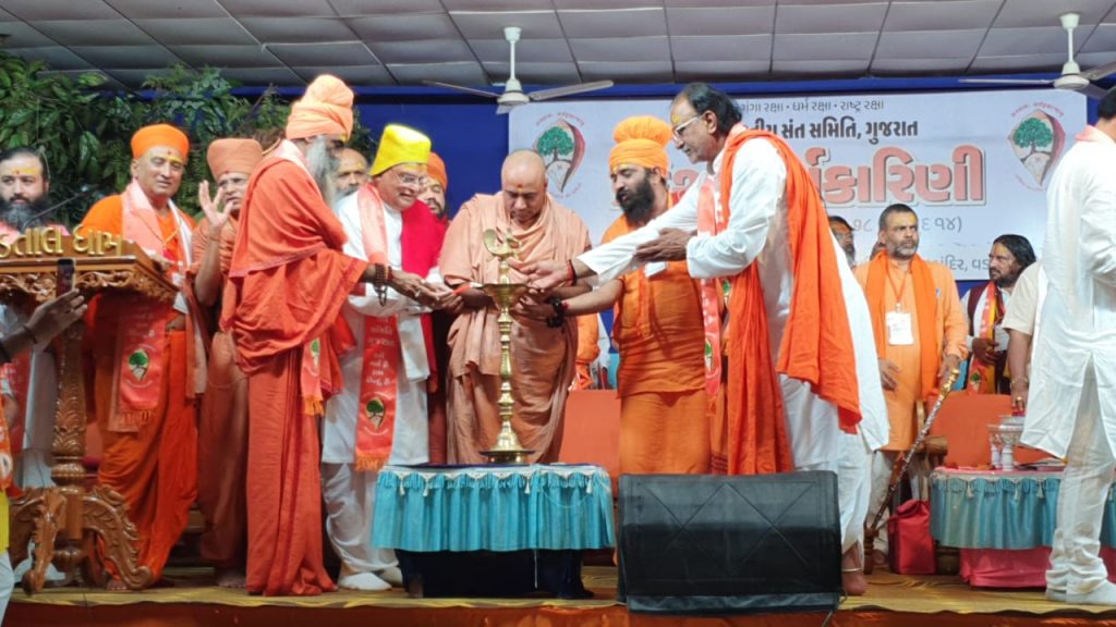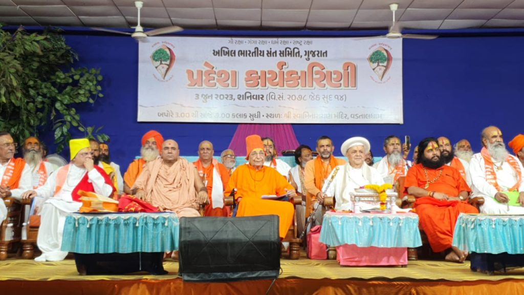વડતાલમાં અખિલ ભારતીય સંત સમિતિ ગુજરાત પ્રદેશની કાર્યકારિણી મળી નડિયાદ વડતાલ શનિવારે ભગવાન સ્વામિનારાયણના તીર્થરાજ વડતાલમાં અખિલ ભારતીય સંત સમિતિ ગુજરાત પ્રદેશની કાર્યકારિણી મળી હતી.જેમાં પદ્મશ્રી સચીદાનંદજી મહારાજ,અવિચલ દાસજી મહારાજ,અખિલ ભારતીય સંત સમિતિના રાષ્ટ્રીય સચિવ રાધે રાધે બાબા,ચૈતન્ય શંભુ મહારાજ, આણદા બાબા આશ્રમના દેવીપ્રસાદજી મહારાજ,મણિનગર સ્વામિનારાયણ મંદિરના પ્રતિનિધિ સંતો,આનંદતીર્થ સ્વામી,સાણંદ,મહામંડલેશ્વર મહાદેવગીરીજી મહારાજ, વિશ્વહિન્દુ પરિષદના ડો.કૌશિકભાઈ વગેરે અનેક સંતો, મહંતોએ ઉપસ્થિત રહી કાર્યક્રમની દીપ પ્રાગટય કરી આ કાર્યકારિણી બેઠકમાં હિન્દૂ સમાજનુંમાર્ગદર્શન કરી આશીર્વાદ આપ્યા હતા.આ પ્રસંગે અખિલ ભારતીય સંત સમિતિના પ્રમુખ નૌતમ સ્વામીએ હિન્દૂ સમાજને જન જાગરણ માટે આહવાન કરતા જણાવ્યું હતું કે, અખિલ ભારતીય સંત સમિતિ એ રાષ્ટ્ર રક્ષા,હિન્દૂ ધર્મ રક્ષા, ગૌરક્ષા માટે કામ કરતી સમર્પિત સમિતી છે.આ સંસ્થા ધર્મધિનિષ્ઠ સરકારનું સમર્થન કરે છે.૨૫ વર્ષ પહેલાં ગુજરાતમાં સ્ટેબિંગનું રાજ હતું. નિર્દોષ નાગરિકો પર એસિડ હુમલા થતા હતા.આજે એ બધું જ ભૂતકાળ બની ગયું છે.ગુજરાતની ધર્મધિનિષ્ઠ સરકારને સંત સમાજનો ટેકો છે ગુજરાત સમગ્ર રાષ્ટ્ર માટે રોલમોડેલ બનતું જાય છે. વર્તમાન ગુજરાત સરકારે બેટ દ્વારકામાં બીનઆધિકૃત દબાણોનો સફાયો કરી બેટ દ્વારિકાને મજારે શરીફ બનતા અટકાવી છે ભગવદગીતા એ હિન્દૂ ધર્મનો પ્રાણ છે. તેમાં માનવમાત્રનો સંદેશો છે.જેને શાળાના અભ્યાસક્રમમાં પ્રવેશ કસરાવવાનો જે નિર્ણય કર્યો છે.જેને સંત સમાજનો ટેકો છે.લવ જેહાદની ઘટનાઓ સામે હિંદુ સમાજની દીકરીઓના માતાપિતાને પોતાની દીકરીઓ સંતાનોને હિન્દૂ ધર્મનું શિક્ષણ સહિત સંસ્કાર આપવા.અને એ દિશામાં હિન્દૂ જન જાગરણ લાવવા અપીલ કરી હતી.આ દેશમાં કોંગ્રેસનું સાશન હતું ત્યારે આપણે ગર્વ સે કહો હમ હિન્દૂ હૈ બોલી શકાતું નહોતું કોંગ્રેસના મુખીયાઓ હજુ પણ મુસ્લિમ તૃષ્ટીકરણ કરવાના નિવેદનો કરે છે. હિન્દૂ ધર્મના સંસ્કારો પૈકી લગ્ન એ પવિત્ર સંસ્કાર છે.ત્યારે હિન્દૂ ધર્મ આધારિત લગ્ન સંસ્થાના જતન માટે પણ અખિલ ભારતીય સંત સમિતિ કટિબદ્ધ છે માં ગંગાના ગૌરવ અને જતન માટે પણ આ સંસ્થા કટિબદ્ધ છે. ગુજરાતમાં અખિલ ભારતીય સંત સમિતિ એક મજબૂત સંસ્થા તરીકે ઉભરી છે.જેના દ્વારા ઠેર ઠેર હિન્દૂ ધર્મ સેનાની રચના કરાઈ છે. આ બેઠકમાં વિધાનસભામાં સંત સમાજનું પ્રતિનિધિત્વ કરતા ધારાસભ્ય ડી કે સ્વામી પણ ઉપસ્થિત રહ્યા હતાં.