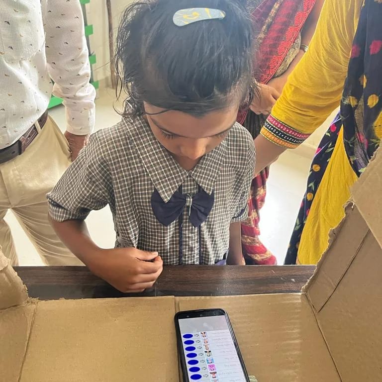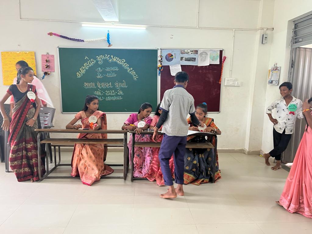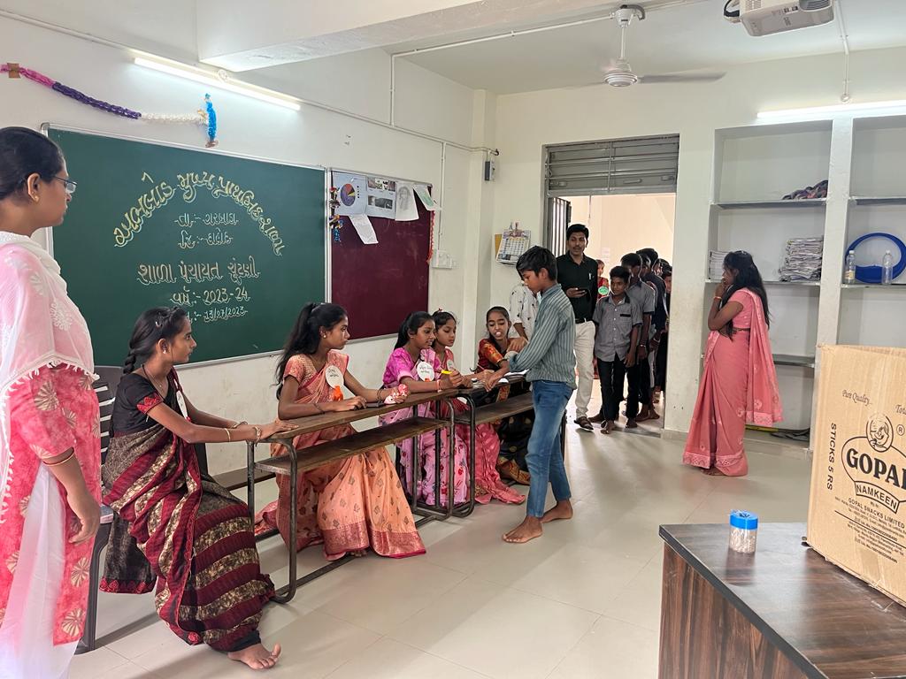 અને સંપૂર્ણ ચૂંટણી પ્રક્રિયા કેવી રીતે થાય છે તે લોકશાહી ઢબે EVM મોબાઇલમાં સોફ્ટવેર ઇન્સ્ટોલ કરી કરી અને બાળકોને વોટીંગ કરી જુદા જુદા ચિન્હો ની માહિતી આપી અને ઇલેક્શન વિશે સંપૂર્ણ માહિતી આપવામાં આવી હતી અને સમગ્ર પ્રક્રિયા શાંતિ પૂર્ણ માહોલ માં પૂર્ણ થઈ. સંપૂર્ણ ટેકનીકલ ની જવાબદારી મહેશ્વરી વાસુદેવભાઈએ તેનું આયોજન કર્યું હતું તેમના આચાર્ય રાઠોડ કમલેશભાઈ તેમજ તમામ સ્ટાફનો ખૂબ જ સારો એવો સાથ સહકાર રહ્યો હતો. જેમાં 10 ઉમેદવાર ઊભા રહ્યા હતા તેમાંથી સૌથી વધારે વોટ મેળવનાર માવી વિક્રમભાઈ લાલચંદભાઈ 127 વોટે વિજય બની મહામંત્રી નું પદ સંભાળ્યું હતું. બીજા નંબર પર 121 વોટ મેળવી મંત્રી ભરવાડ જીવનકુમાર રમેશભાઈએ પોતાનું સ્થાન નિશ્ચિત કર્યું હતું. આમ તમામ શાળાઓમાં એક લોકશાહીનો અવસર સરસ રીતે મનાવવામાં આવ્યો હતો અને બાળકોને પણ ખૂબ જ મજા આવી હતી.