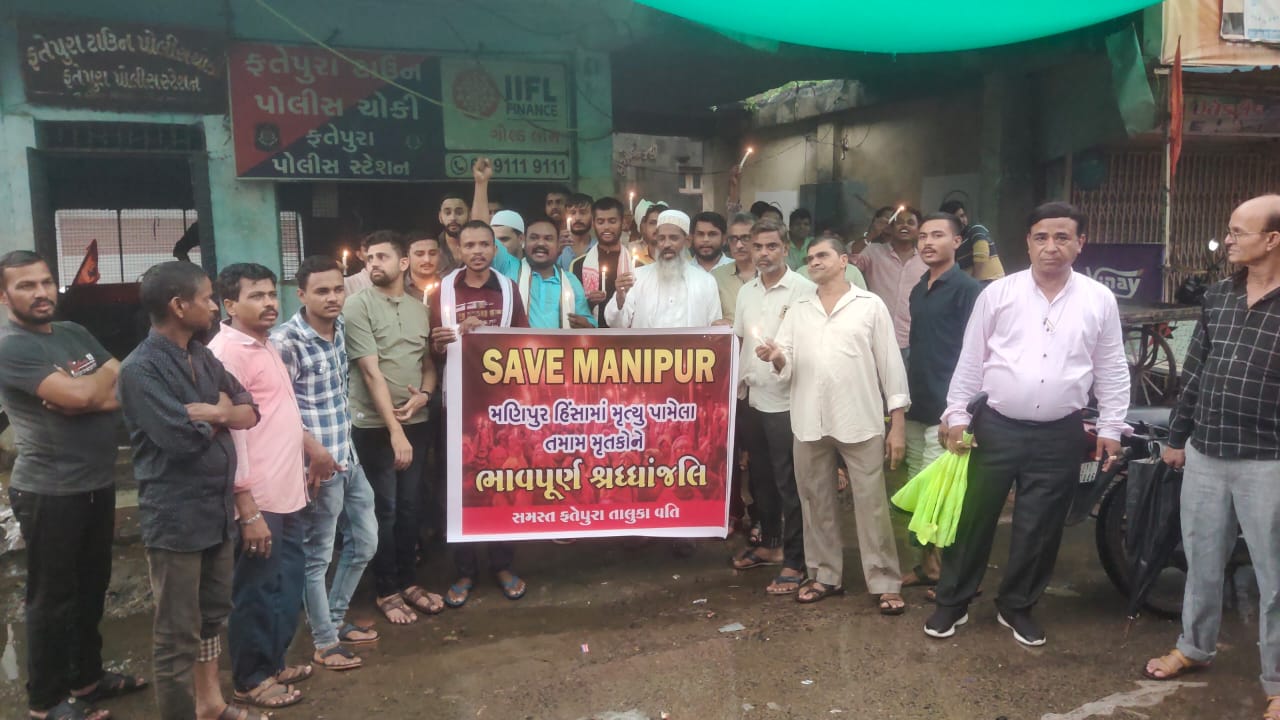 મણીપુર રાજ્યમાં હિંસામાં મૃત્યુ પામેલા મૃતકોને શ્રદ્ધાંજલિ આપવામાં આવીફતેપુરા નગરમાં મૌન રેલી કાઢી મીણબત્તી પ્રગટાવી મૌન પાળી મૃતકોને શ્રદ્ધાંજલિ આપવામાં આવી. ફતેપુરા તાલુકાના મુખ્ય મથક ફતેપુરા નગરમાં આજરોજ આદિવાસી સમાજ સહિત તમામ સમાજના લોકો સાંજના સમયે જુના બસ સ્ટેશન પોલીસ ચોકી નજીક મણીપુર રાજ્યમાં હિંસામાં મૃત્યુ પામેલા તમામ મૃતકોને બે મિનિટનું મૌન પાળી મીણબત્તી પ્રગટવી ફતેપુરા નગરના વિવિધ માર્ગો પર શાંતિપૂર્ણ રીતે મૌન રેલી યોજી મણીપુર રાજ્યમાં હિંસામાં મૃત્યુ પામેલા તમામ મૃતકોને ભાવપૂર્ણ શ્રદ્ધાંજલિ અર્પણ કરવામાં આવેલ હતી ફતેપુરાના તમામ સમાજના લોકો જોડાયા હતા