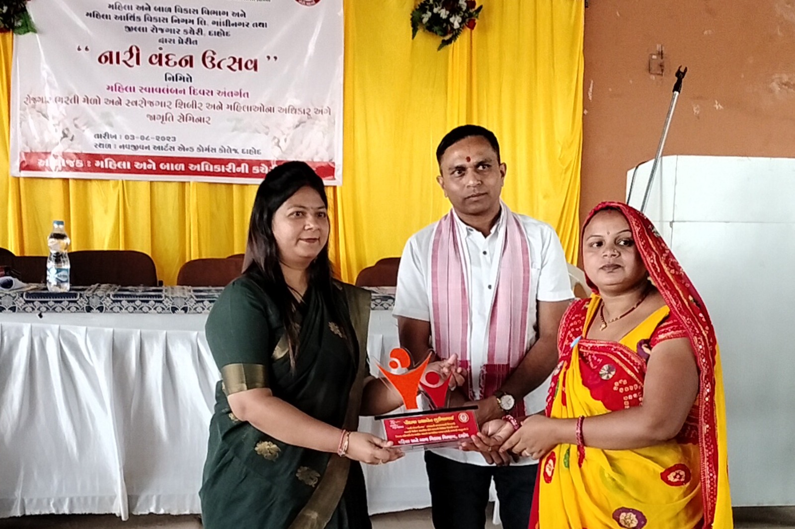 નવજીવન આર્ટસ એન્ડ કોમર્સ કોલેજ ખાતે નારી વંદન ઉત્સવ-૨૦૨૩ ના ભાગ રૂપે મહિલા સ્વાવલંબન દિવસ ની ઉજવણી કરવામાં આવી સમાજ વ્યવસ્થાના ભાગરૂપે દરેક મહિલાએ પોતાને મળતા સમયમાં પોતાનામાં રહેલી શક્તિનો વિકાસ કરવો જોઈએ શ્રીમતી શિતલબેન વાઘેલા નારી વંદન ઉત્સવ’ ૧૧ બાળાઓને ‘‘વ્હાલી દીકરી યોજના’’ના મંજૂરી હુકમોનું વિતરણ થયું દાહોદ – ગુરુવાર- નવજીવન આટર્સ એન્ડ કોમર્સ કોલેજ ખાતે “નારી વંદન ઉત્સવ” નિમિત્તે “મહિલા સ્વાવલંબન દિવસની” ઉજવણી કાર્યક્રમ અંતર્ગત સ્વરોજગાર માર્ગદર્શન સેમીનાર યોજાયો. મહિલા અને બાળ વિકાસ અધિકારીશ્રીની કચેરી દ્વારા તેમજ જિલ્લા વહીવટી તંત્રના અન્ય વિભાગો / કચેરીઓ મારફતે મેળવેલ સ્વરોજગાર તેમજ રોજગાર, જિલ્લાની મહિલાઓના સન્માન તેમજ રોજગાર મેળવવા માંગતા મહિલાઓ માટે સેમિનારનું આયોજન કરવામાં આવ્યું. જેમાં જિલ્લા પંચાયત પ્રમુખ શ્રીમતી શીતલબેન વાઘેલા અધ્યક્ષ સ્થાને કાર્યક્રમ યોજાયો હતો. ગુજરાત સરકાર દ્વારા રાજ્યના મહિલા અને બાળ વિકાસ વિભાગ દ્વારા મહિલાઓના સશક્તિકરણ, સુરક્ષા અને વિકાસને ઉજાગર કરવા રાજ્યભરમાં વિવિધ થીમ હેઠળ ‘નારી વંદન ઉત્સવ’ની સાપ્તાહિક ઉજવણી કરવામાં આવી રહી છે. જે અંર્તગત રાજ્ય સરકારના મહિલા અને બાળ વિકાસ વિભાગ દ્વારા નારી વંદન ઉત્સવ ૧ લી થી ૭મી ઓગસ્ટ સુધી ઉજવવાનું આયોજન કરવામાં આવ્યું છે. જે દરમિયાન વિવિધ થીમ આધારિત પ્રવૃત્તિઓ થશે. તેને ધ્યાનમાં રાખીને દાહોદ જિલ્લામાં ત્રીજા દિવસે “મહિલા સ્વાવલંબન દિવસ” તરીકે ઉજવ્યો હતો. સમાજ વ્યવસ્થાના ભાગરૂપે દરેક મહિલાએ પોતાને મળતા સમયમાં પોતાનામાં રહેલી શક્તિનો વિકાસ કરવો જોઈએ. શ્રીમતી શીતલબેન વાઘેલા એ રાજય સરકારની ઉપલ્ધીઓ વિશે જણાવ્યું હતું. આ સરકારની નિતીઓને કારણે આવનારા દિવસોમાં દરેક મહિલાઓને સ્વનિર્ભર થવાની તક ઊભી થઈ છે. સમાજ વ્યવસ્થાના ભાગરૂપે દરેક મહિલાએ પોતાને મળતા સમયમાં પોતાનામાં રહેલી શક્તિનો વિકાસ કરવો જોઈએ. કુટુંબમા તેમજ રાષ્ટ્રમાં ઉપયોગી મહિલાઓનું યોગદાન વધે તે માટે રાજ્યસરકાર સતત કટીબદ્ધ છે. આ કાર્યક્રમમાં વિવિધ સહાય હેઠળ મહિલાઓને ચેક અર્પણ કરાયાં હતા. ૧૧ બાળાઓને ‘‘વ્હાલી દીકરી યોજના’’ના મંજૂરી હુકમોનું વિતરણ થયું હતું.આ પ્રસંગે ઉપસ્થિત ધારાસભ્ય શ્રી કનૈયાલાલ કિશોરીએ જણાવ્યું કે, રાજ્ય સરકારે મહિલા સન્માન, સુરક્ષા, સલામતીને કેન્દ્રસ્થાને રાખીને અનેકવિધ યોજનાઓ, કાર્યક્રમો, ઝુંબેશો થકી મહિલા સશક્તિકરણની દિશામાં ખુબ જ સરાહનીય કામગીરી કરી છે. સમાજની પ્રત્યેક મહિલાઓ જાગૃત અને સશક્ત બની ગામ, જિલ્લા તેમજ રાજ્ય અને રાષ્ટ્રના વિકાસમાં સિંહફાળો આપવા સક્ષમ બની રહી છે. દાહોદ જિલ્લાની દીકરીઓ પણ નિર્ભિક, શિક્ષિત અને સશક્ત બનીને દેશના વિકાસમાં સિંહફાળો આપે તેવ
