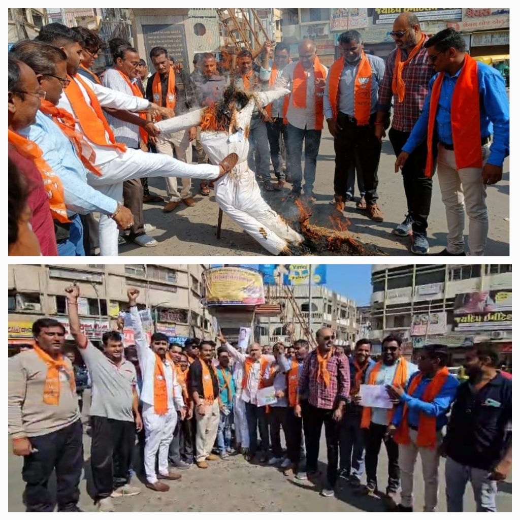કોંગ્રેસ નેતા રાહુલ ગાંધીએ વડાપ્રધાન સામે જ્ઞાતિ આધારિત અભદ્ર ભાષાનો ઉલ્લેખ કરતા ખેડા જિલ્લા ભાજપ બક્ષીપંચ યુવા મોરચા દ્વારા વિરોધ સાથે દેખાવો કરાયા, રાહુલ ગાંધીના પૂતળાનું દહન કરાયુંવિરોધ પક્ષના કોગ્રેસ નેતા રાહુલ ગાંધીએ દેશના વડાપ્રધાન નરેન્દ્રભાઈ મોદી અંગે જ્ઞાતિ આધારિત અભદ્ર ભાષાનો ઉલ્લેખ કરવા મામલે દેશ ભરમાં વિરોધના થઇ રહ્યો છે. ત્યારે ખેડા જિલ્લાના મુખ્ય મથક નડિયાદમાં સરદારની પ્રતિમા પાસે જિલ્લા ભાજપ બક્ષીપંચ યુવા મોરચા દ્વારા વિરોધ પ્રદર્શન કરવા આવ્યુ. રાહુલ ગાંધીએ ભારત જોડો ન્યાય યાત્રામાં વડાપ્રધાન નરેન્દ્રભાઈ મોદી અંગે જ્ઞાતિ આધારિત અભદ્ર ભાષાનો ઉલ્લેખ કરવા મામલે સમગ્ર દેશમાં ભાજપના કાર્યકરો સાથે મોદીના ચાહકોમાં ભારે નારાજગી પ્રસરી હતી. આ મામલે ખેડા જિલ્લા ભાજપ બક્ષીપંચ યુવા મોરચા દ્વારા આજે શુક્રવારે વિરોધ સાથે દેખાવો કરાયા છે. નડિયાદ શહેરના નગરપાલિકાના ગેટથી રેલી કાઢી સરદારની પ્રતિમા પાસે સૌ કાર્યકરો ભેગા થઇ કાર્યકરોએ રાહુલ ગાંધી માફી માંગે તેવા સૂત્રોચ્ચાર કર્યા હતા. અને રાહુલ ગાંધીના પૂતળા દહન કર્યું હતું.