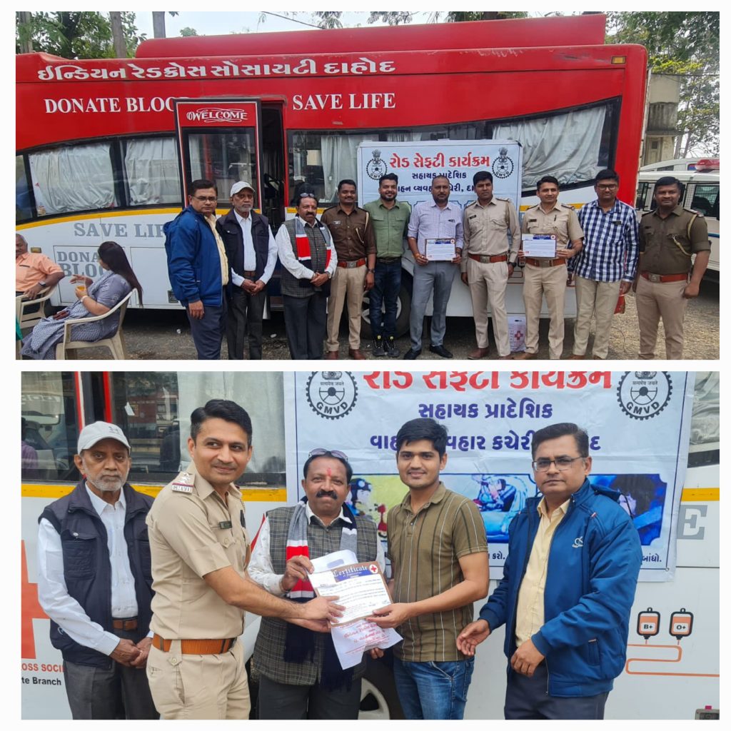 રોડ સેફટી કાયૅકમ અંતર્ગત સહાયક પ્રાદેશિક વાહન વ્યવહાર કચેરી દાહોદ દ્વારા ઈન્ડિયન રેડક્રોસ સોસાયટી દાહોદ ના સહયોગથી આર.ટી.ઓ કચેરી દાહોદ ખાતે રકતદાન કેમ્પ નુ આયોજન કરવામાં આવ્યું હતુ.આ અવસર પર એ.આર ટી ઓ કચેરી ના અધિકારીઓ.ઈન્સપેકટરો. કમૅચારીઓ દ્વારા ઉત્સાહ પુવૅક રકતદાન કરવામાં આવ્યું હતુ આ પ્રસંગે ખાસ ઉપસ્થિત જીલ્લા પંચાયત દાહોદ ના માજી પ્રમુખ શ્રીમતી શીતલબેન વાધેલા એ પણ રકતદાન આપી માનવસેવા ના કાયૅ મા સહભાગી થયા હતા. આ રકતદાન કેમ્પ મા રેડક્રોસ સોસાયટી ની બ્લડ બેક ના કન્વિનર એન.કે પરમાર. ખજાનચી કમલેશભાઈ લીમ્બચીયા કારોબારી સભ્ય મુકન્દભાઈ કાબરાવાલા તેમજ સેવાભાવી ડો.નરેશ ચાવડા ઉપસ્થિત રહી રકતદાતાઓ ની સેવા ઓ ને બીરદાવી હતી