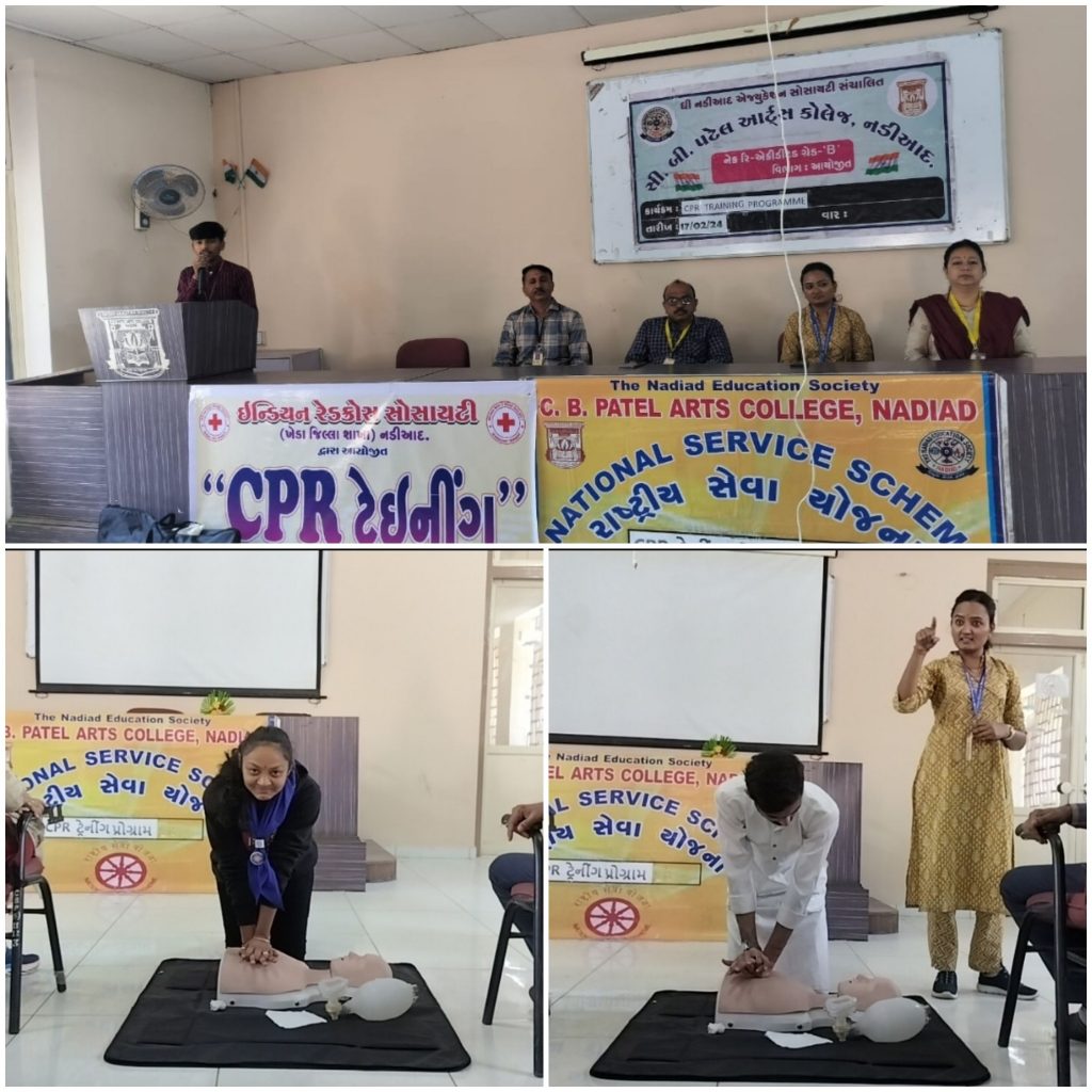 નડિયાદ સી.બી.પટેલ આર્ટ્સ કોલેજના એન.એસ.એસ. યુનિટ અને મનોવિજ્ઞાન વિભાગ તથા ઇન્ડિયન રેડક્રોસ સોસાયટીના સંયુકત ઉપક્રમે સીપીઆર ટ્રેઇનિંગ’ વર્કશોનું આયોજન કરવામાં આવ્યું હતું. દિનશા પટેલ નર્સિંગ કોલેજના પ્રો. અર્પિતાબેન વૈદ્યએ વિદ્યાર્થીઓને સીપીઆર ક્યારે, કેવા સંજોગોમાં અને કેવી રીતે આપી શકાય તેનું નિદર્શન કરી ખૂબ જ સુંદર સમજુતી આપી હતી. સંજોગો વશાત સીપીઆર આપવાનુ થાય તો શું કરવુ તેનું પ્રાયોગિક જ્ઞાન સંપાદિત કર્યુ હતું. કાર્યક્રમની શરૂઆત કું.વિધિ ચૌહાણે કરેલ પ્રાર્થનાથી થઈ હતી. મનોવિજ્ઞાન વિભાગનાં અધ્યક્ષ અને એનસીસી પ્રોગ્રામ ડો.પ્રકાશભાઇ વિછીયાએ ઊપસ્થિત સર્વેનું શાબ્દિક સ્વાગત કર્યું હતું. ઇન્ડીયન રેડક્રોસ સોસાયટીના નિકિલેશભાઈ પંડિતે સમગ્ર આયોજનમાં મહત્ત્વની ભૂમિકા ભજવી હતી. આચાર્યએ વિદ્યાર્થીઓને સીપીઆર ટ્રેઇનિંગ સમાજ ઊપયોગી કાર્ય કરવા હાંકલ કરી અને ઊપસ્થિત સૌને આશીર્વચન પાઠવ્યા હતા. ડો.અર્પિતાની ચાવડાએ આભાર વિધિ કરી હતી અને સમગ્ર કાર્યક્રમનું સંચાલન એનએસએસ સ્વયંસેવક કમલેશ સોઢાએ કર્યું હતું.