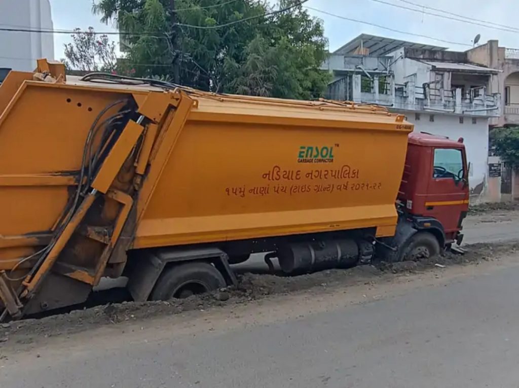 નડિયાદ પાલિકાની કચરો ભરવાની ટ્રક માઈ મંદિર રોડ પર ખાડામા ફસાઈ