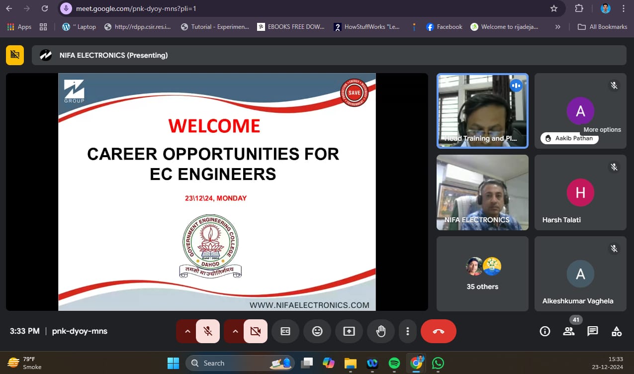 સરકારી ઇજનેરી કોલેજના ટ્રેનિંગ અને પ્લેસમેન્ટ વિભાગ દ્વારા ઇલેકટ્રિકલ અને ઇલેક્ટ્રોનિક્સના વિદ્યાર્થીઓ માટે ઇલેક્ટ્રોનિક્સ ફિલ્ડમાં કારકિર્દીની ઉજ્જવળ તકો માટે શ્રી નિખિલ શાહ, ટેક્નિકલ ડિરેક્ટર, નિફા ઇલેક્ટ્રોનિક્સ પ્રાઇવેટ લિમિટેડને આમંત્રિત કરવામાં આવ્યા હતા.