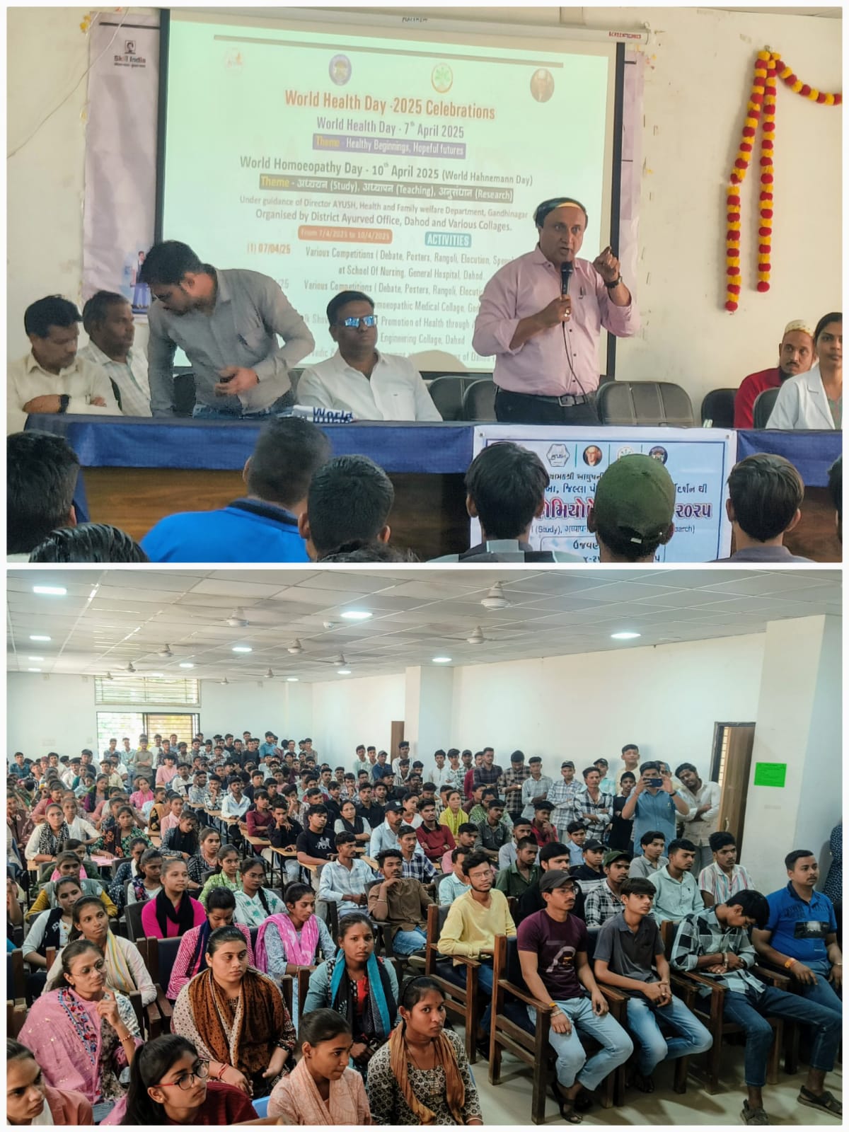નિયામકશ્રી આયુષ કચેરી ગાંધીનગર તથા જિલ્લા આર્યુવેદ અધિકારીશ્રી દાહોદના માર્ગદર્શન હેઠળ સરકારી હોમીઓપેથીક દવાખાના નિમનળિયા દાહોદ દ્વારા વિશ્વ આરોગ્ય દિવસ અને વિશ્વ હોમિયોપેથી દિવસની ઉજવણી ભાગરૂપે આઈ.ટી.આઈ. દાહોદ ખાતે વિદ્યાર્થીઓને હોમીયોપેથી વિશે માહિતી આપવામાં આવી હતી તથા દવાના પ્રકાર તેના ઉપયોગ વિશે માહિતી આપવામાં આવી હતી. અને સાથે હીટ વેવની જાણકારી અને તેનાથી બચવાના ઉપાયો વિશે વિદ્યાર્થીઓને માહિતગાર કરવામાં આવ્યા હતા. તથા ડો. દેવેન્દ્ર ડામોર દ્વારા લાઈફ સ્ટાઇલ બીમારીઓની માહિતી આપવામાં આવી હતી.