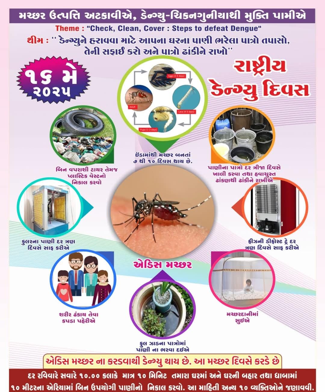 દર વર્ષે ૧૬ મી મે ના રોજ રાષ્ટ્રીય ડેન્ગ્યુ દિવસની ઉજવણી મચ્છરજન્ય રોગ અને તાવ વિશે જાગૃતિ ફેલાવવા માટે કરવામાં આવે છે. કેન્દ્રીય આરોગ્ય અને પરિવાર કલ્યાણ મંત્રાલય દ્વારા વર્ષ ૨૦૨૫ માં આ રોગની નાબૂદી માટે ” Check, Clean,Cover: Steps to defeat Dengue “. Theme for National Dengue Day – 16 th May 2025 (તપાસો, સાફ કરો, ઢાંકો: ડેન્ગ્યુને હરાવવાનાં પગલાં”.) થીમ સાથે અભિયાન હાથ ધરવામાં આવ્યું છે.