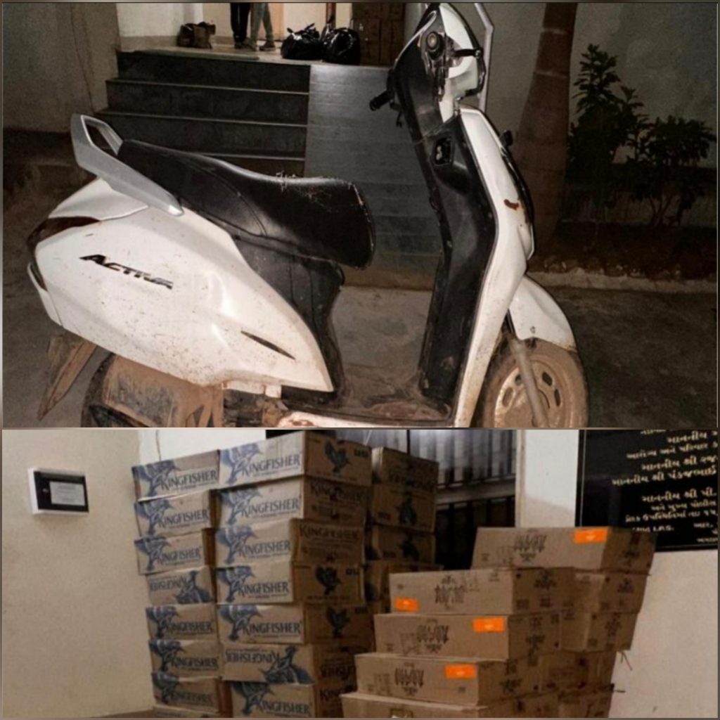 આ બાતમીના આધારે પોલીસે તાત્કાલિક સ્થળ પર દરોડો પાડ્યો હતો. પોલીસને જોઈને આરોપીઓ અંધારાનો લાભ લઈને ખેતરોમાં ભાગી ગયા હતા. પોલીસે તેમનો પીછો કર્યો પરંતુ તેઓ પકડાયા નહોતા. પોલીસે સ્થળ પર તપાસ કરતાં ખેતરમાંથી પુઠાના બોક્સમાં રાખેલો વિદેશી દારૂ અને બિયરની પેટીઓ મળી આવી હતી. સાથે જ એક નંબર વગરની એક્ટિવા પણ મળી આવી હતી. એક્ટિવાની ડીકી અને આગળના ભાગમાં કાળી પ્લાસ્ટિકની કોથળીઓમાં પણ દારૂની બોટલો મળી આવી હતી.