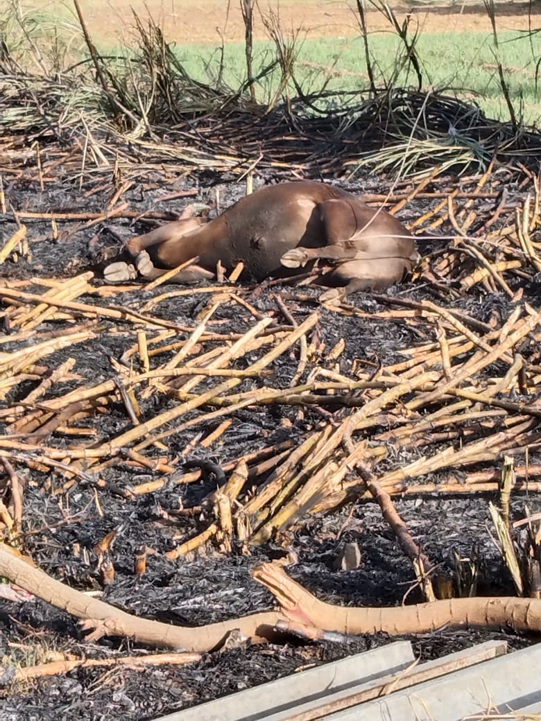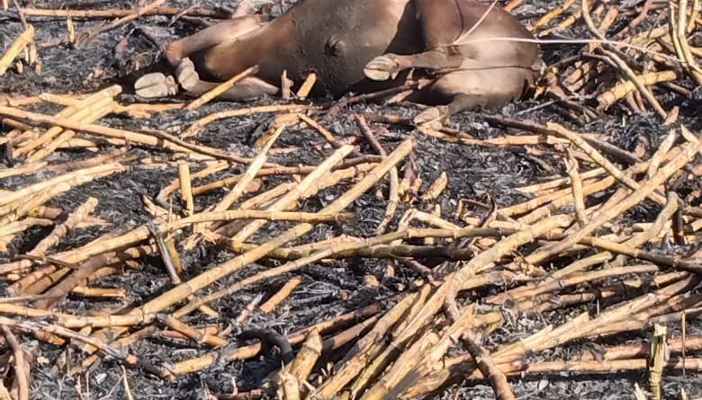 ફોટો÷ લખણપુરમાં વીજ કરંટ ના લીધેલ મોતને ભેટેલા બળદ તથા બળી ગયેલ શેરડીનું ખેતર નજરે પડે છે.