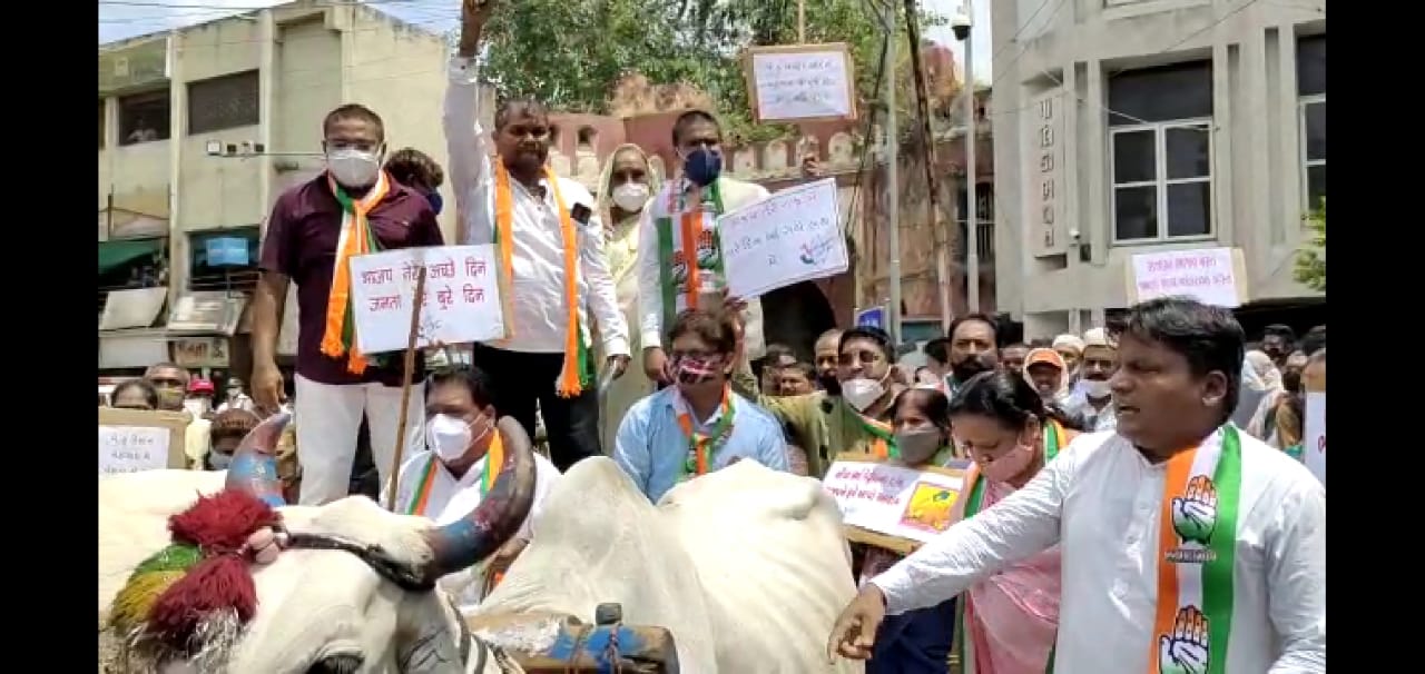એક તરફ કોરોના મહામારી ત્યારે બીજી તરફ વધતી મોંધવારીથી દેશવાસીઓ ત્રાહિમામ્ પોકારી ઉઠ્યાં છે. ગરીબ અને મધ્યમ વર્ગીય પરિવારને પોતાનું ગુજરાન ચલાવવું મુશ્કેલ બન્યું છે તેવામાં પેટ્રોલ,ડીઝલ અને અન્ય ચીજ વસ્તુઓના વધતાં ભાવોને કારણે પડતા ઉપર પાટું સાબીત થઈ રહ્યું છે. ગૃહિણીઓના બજેટ પણ ખોરવાયાં છે ત્યારે પેટ્રોલ, ડીઝલના ભાવાનોમાં પણ ઐતિહાસીક સતત વધારો થઈ રહ્યો છે. આજરોજ દાહોદ જિલ્લા કોંગ્રેસ સમિતિ દ્વારા વધતાં ભાવોનેના વિરોધમાં વિરોધ પ્રદર્શનનું આયોજન કરવામાં આવ્યું હતું. કોંગ્રેસ સમિતિના આગેવાનો દાહોદ તાલુકા પંચાયત ખાતે એકત્રીત થયાં હતાં ત્યાંથી બળદ ગાડા પર ભવ્ય રેલી શહેરમાં નીકળી હતી. આ રેલી તાલુકા પંચાયતથી યાદગાર ચોક થઈ નગરપાલિકા પહોંચી હતી અને ત્યાં સરકાર વિરોધી ભારે સુત્રોચ્ચાર કરવામાં આવ્યાં હતાં.