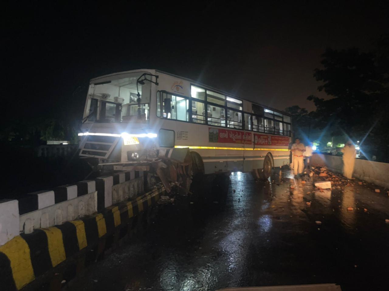 ગઈકાલે બપોર બાદ દાહોદ જિલ્લામાં મેઘરાજાની ધમાકેદાર એન્ટ્રી થઈ હતી. ઠેરઠેર વરસાદી પાણી ભરાઇ ગયા હતા ત્યારે મળતી માહિતી પ્રમાણે ગતરોજ લગભગ રાત્રીના સાડા બાર વાગ્યાના આસપાસ સુરેન્દ્રનગર થી દાહોદ આવતી એસટી બસ દાહોદ જિલ્લાના લીમખેડા સ્થિત હડફ નદીના પુલ પરથી પસાર થઇ રહી હતી. રાત્રિના ૧૨ વાગ્યાના આસપાસ વરસાદ પણ પડતો હતો ત્યારે વરસાદના કારણે ડ્રાઈવરને અંધારપણો જોવાતા ડ્રાઈવરે સ્ટિયરિંગ પરનો કાબુ ગુમાવ્યો હતો અને રસ્તાની બાજુમાં આવેલ ડિવાઇડર પર એસટી બસ ચઢી ગઈ હતી. એક ક્ષણે એસટી બસમાં સવાર મુસાફરોના જીવ તાળવે ચોંટી ગયા હતા પરંતુ ડ્રાઇવરની સમજ, સૂચકતાના કારણે મોટો માર્ગ અકસ્માત સર્જાતો બચ્યો હતો. સદ્નસીબે આ માર્ગ અકસ્માતમાં કોઇ પ્રકારની જાનહાનિ ન થતા સૌએ હાશકારો અનુભવ્યો હતો ત્યારે ઘટનાની જાણ નજીકની પોલીસને થતા પોલીસ પણ તાત્કાલિક સ્થળ પર દોડી આવી હતી.