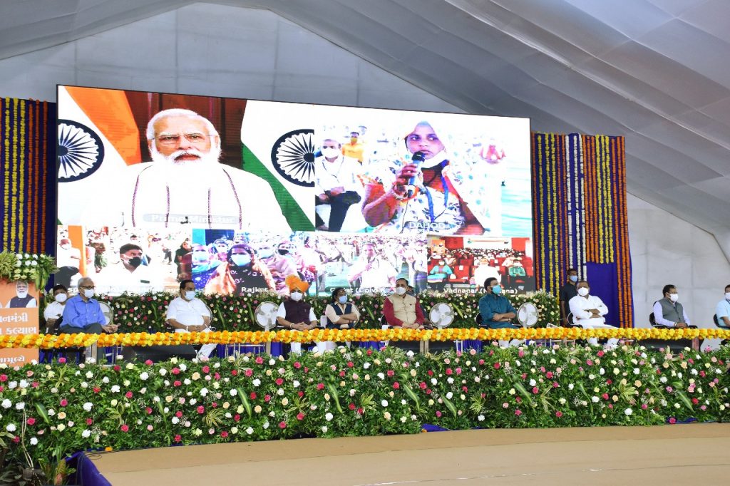 તેમણે કહ્યું કે, ગુજરાતમાં એક સમયે પાણી માટે મહિલાઓને ઘણા દૂર સુધી જવું પડતું હતું. પરંતુ, સરદાર સરોવર યોજના, સૌની યોજના, નહેરોના નેટવર્કને પરિણામે આજે મા નર્મદાનું પાણી ગુજરાતના ગામેગામ અને ઘરેઘરે પહોંચ્યું છે. મા નર્મદાનું નામમાત્ર લેવાથી પુણ્ય મળે છે એ પાણી આજે નળ મારફત ઘર સુધી આવ્યું છે. જલ જીવન મિશન હેઠળ છેલ્લા બે વર્ષમાં સાડા ચાર કરોડ પરિવારોને આવરી લેવામાં આવ્યા છે. આઝાદી બાદ માત્ર ૩ કરોડ પરિવારોના ઘરે પાણીના નળ હતા. ગુજરાતમાં આજે નલ સે જલ યોજના પૂરી થવાના આરે છે. એ વાત ખુશી છે.